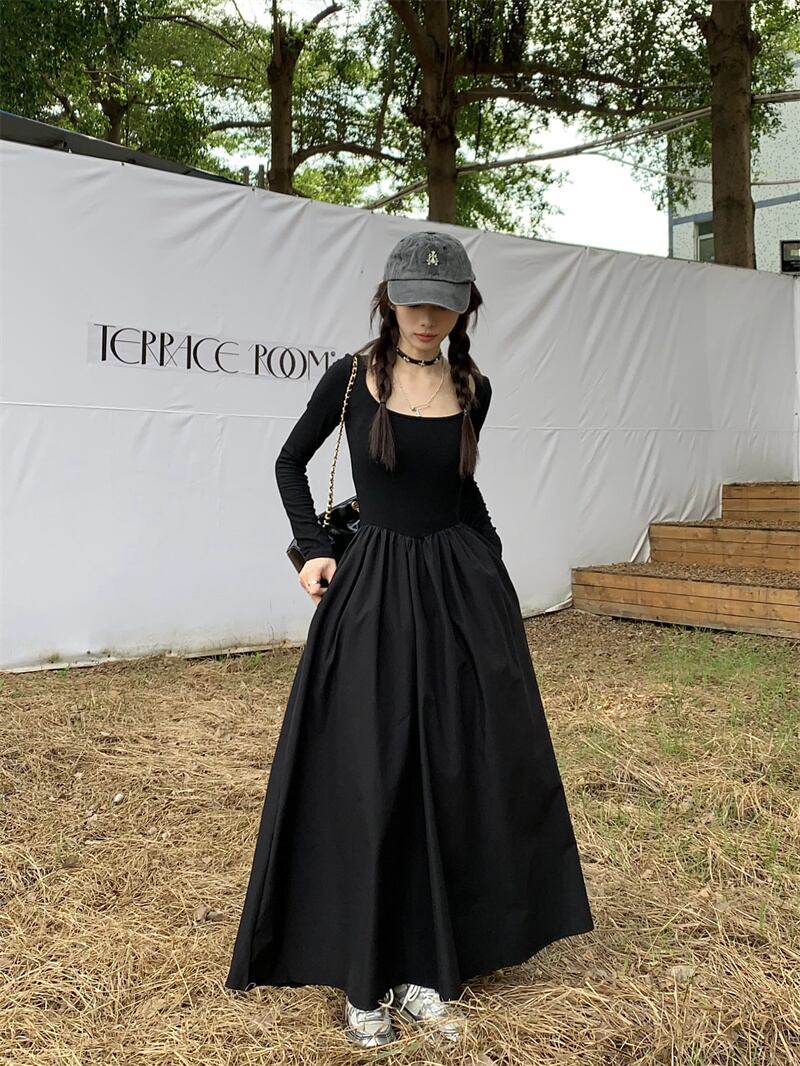 ドレス レディース ワンピース 送料無料 2色 長袖 ラウンドネック ハイウエスト ロング丈 フレアワンピース スリット Aライン ボタン ボリューム パフ スリーブ フレア 大人可愛い きれいめ シンプル カジュアル 大人 上品 おしゃれ お洒落 こなれ感 ラフ キュート ガーリー ルーズ エレガント 存在感 抜け感 20代 30代 40代 ビジネス OL 通勤 学生 通学 デート 着回し 普段使い 韓国系 ブラック カーキ S M L