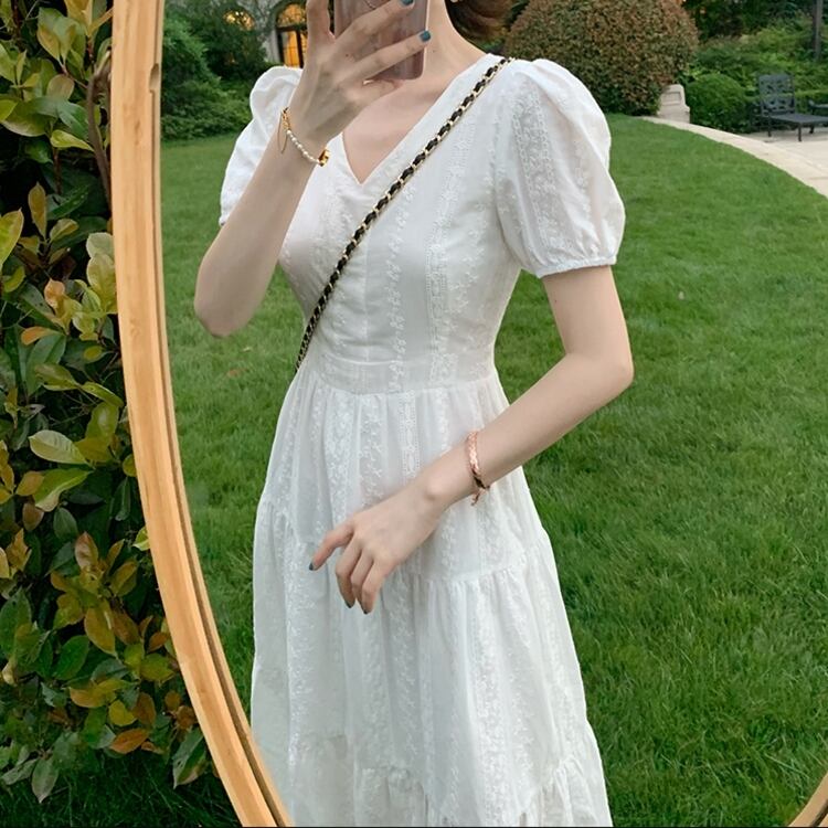 ワンピース レディース 送料無料 フレアワンピース ロング丈 ミモレ丈 Vネック チェックパフスリーブ 襟なし レース襟 半袖 体型カバー シンプル 大人可愛い きれいめ お洒落 おしゃれ 大人女子 ワンピドレス イベント デート パーティ— 女子会 休日 お出かけ 韓国 オルチャン ファッション コーデ かわいい 大人可愛い きれいめ シンプル 大人 上品 おしゃれ お呼ばれ 二次会 かわいい モテコーデ ベーシック 大人かわいい インスタ トレンド モテコーデ ホワイト S M L XL