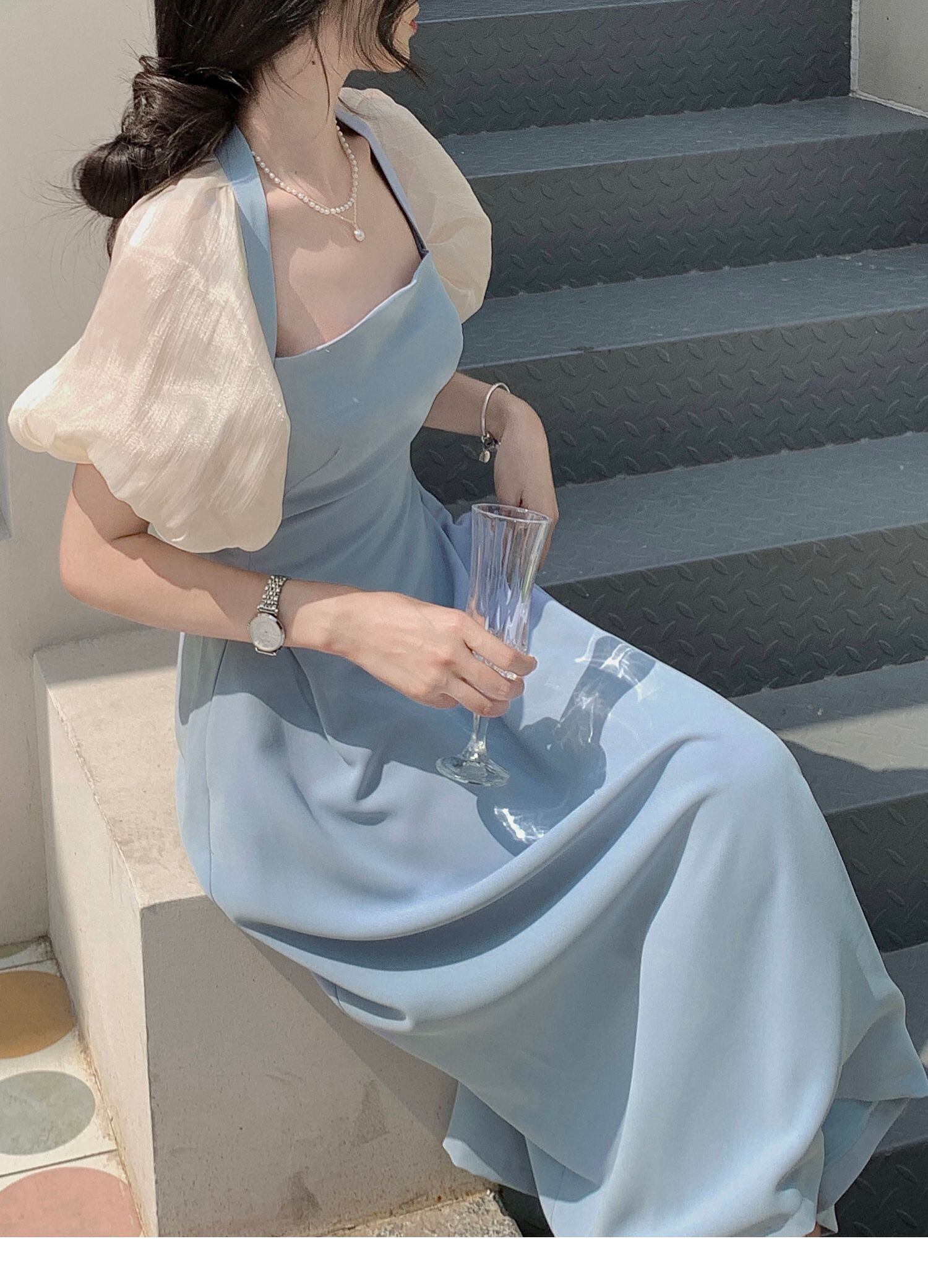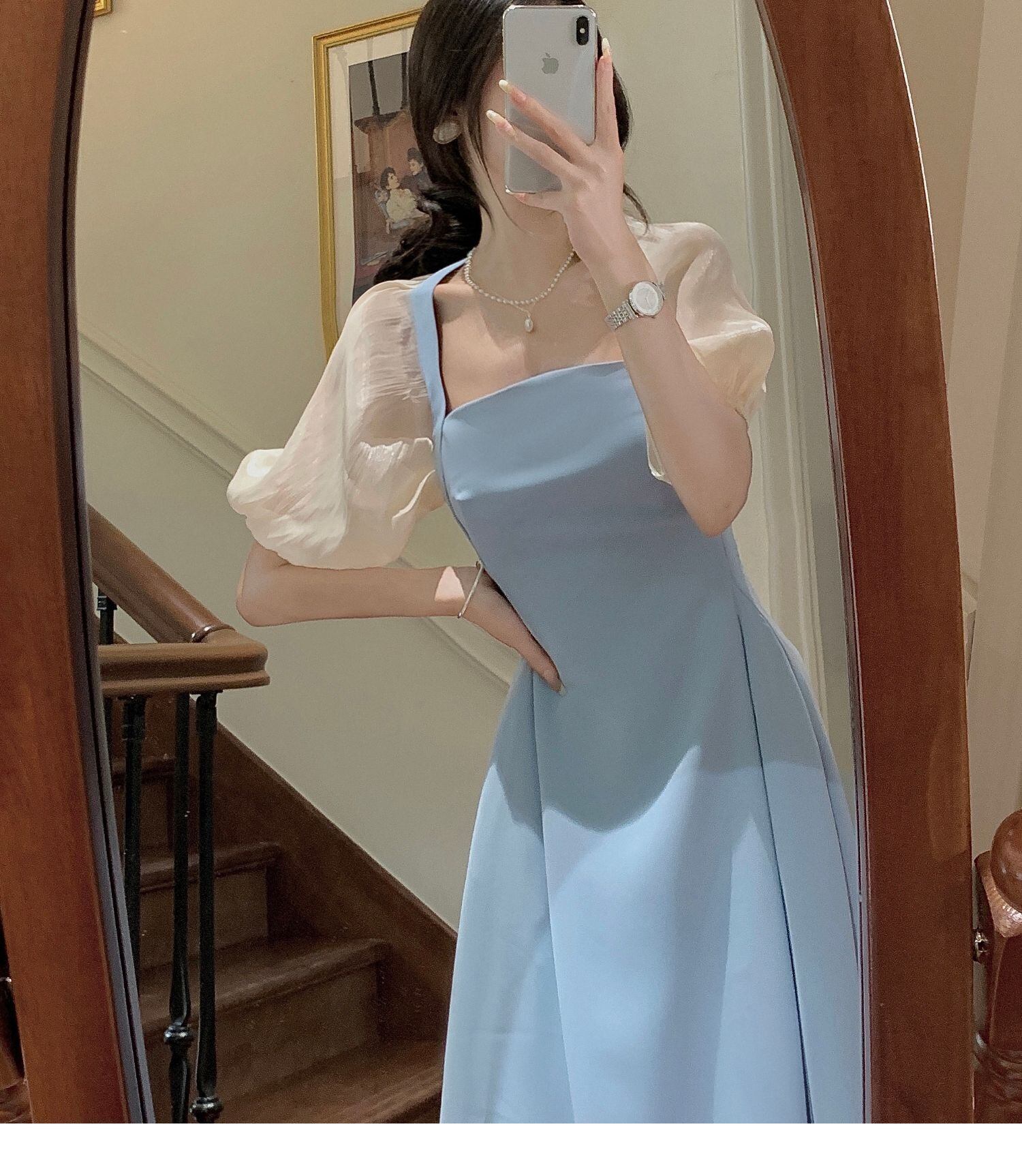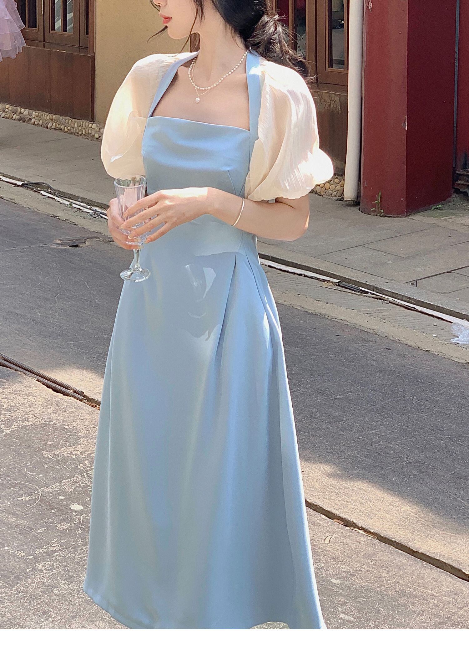 ワンピース レディース 送料無料 フレアワンピース ミモレ丈 メタリック ツヤ感 シフォン 切り替え スクエアネック パフスリーブ 襟なし 透け感 半袖 体型カバー シンプル 大人可愛い きれいめ お洒落 おしゃれ 大人女子 イベント デート パーティ— 女子会 休日 お出かけ ファッション コーデ かわいい 大人可愛い きれいめ シンプル 大人 上品 おしゃれ お呼ばれ 二次会 かわいい モテコーデ ベーシック 大人 かわいい インスタ トレンド モテコーデ ブルー 春 夏 S M L XL