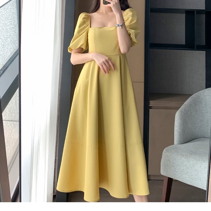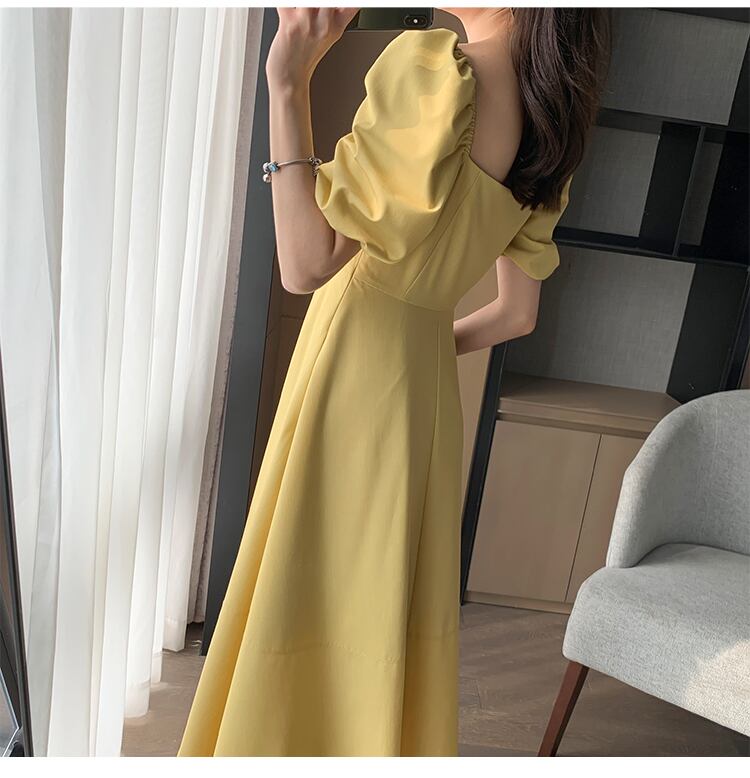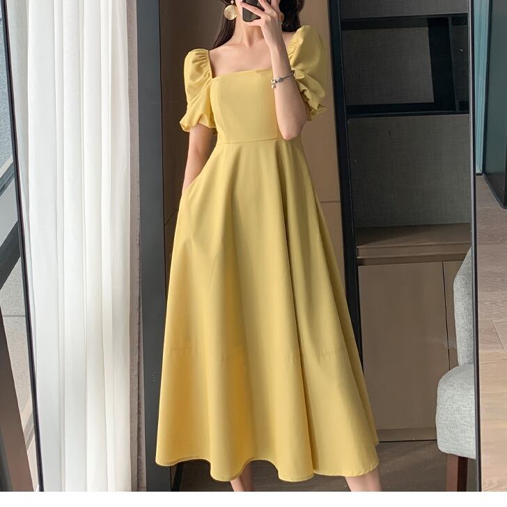 ワンピース レディース 送料無料 3色 フレア ミモレ丈 切り替え スクエアネック パフスリーブ 襟なし 半袖 体型カバー シンプル 大人可愛い きれいめ お洒落 おしゃれ 大人女子 イベント デート パーティ— 女子会 休日 お出かけ ファッション コーデ かわいい 大人可愛い きれいめ シンプル 大人 上品 おしゃれ お呼ばれ 二次会 かわいい モテコーデ ベーシック かわいい インスタ トレンド イエロー レッド ブラック 春 夏 大きいサイズ S M L XL 2XL 3XL 4XL