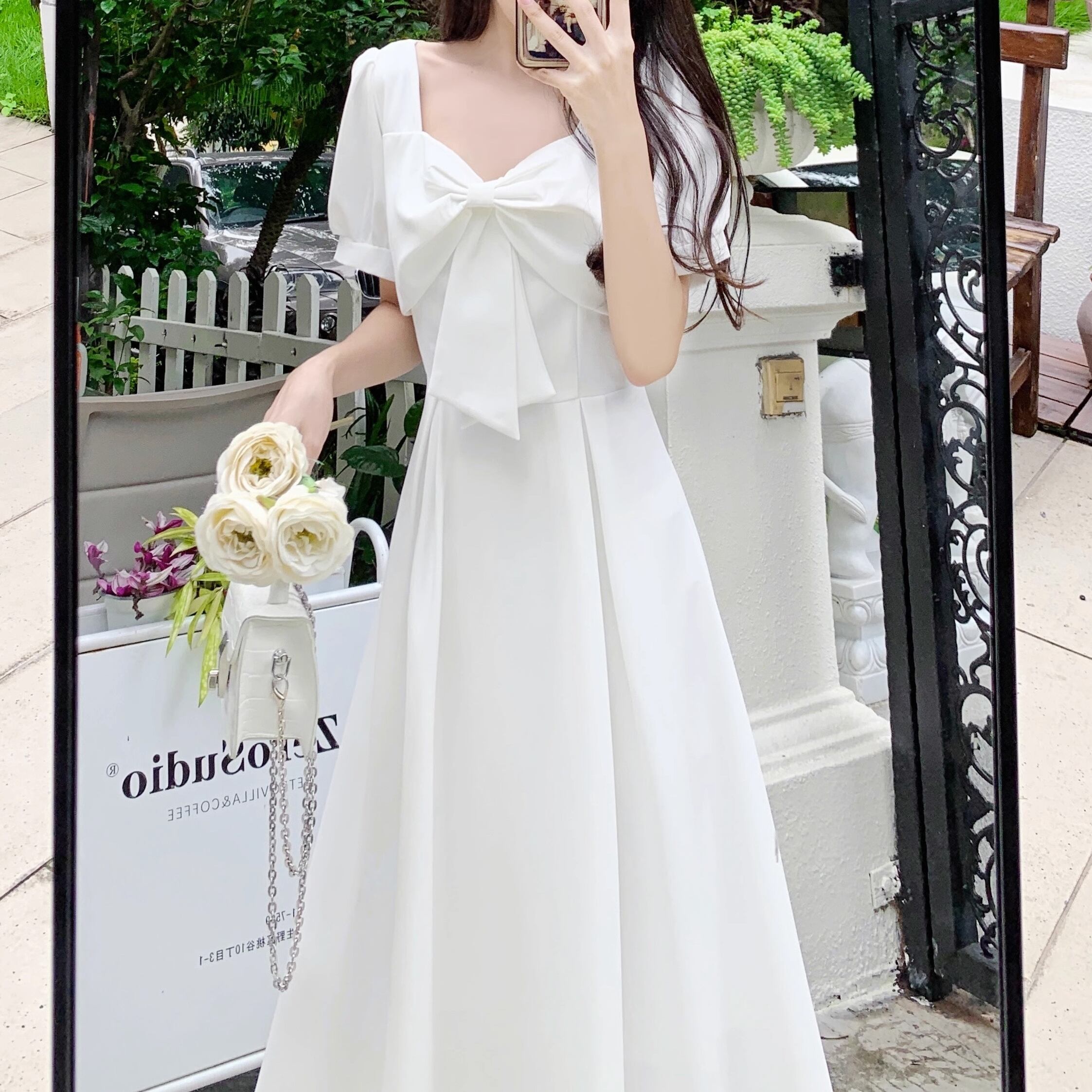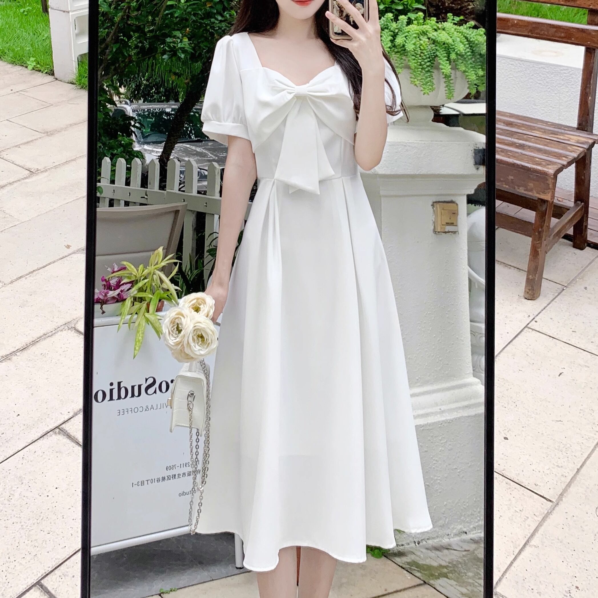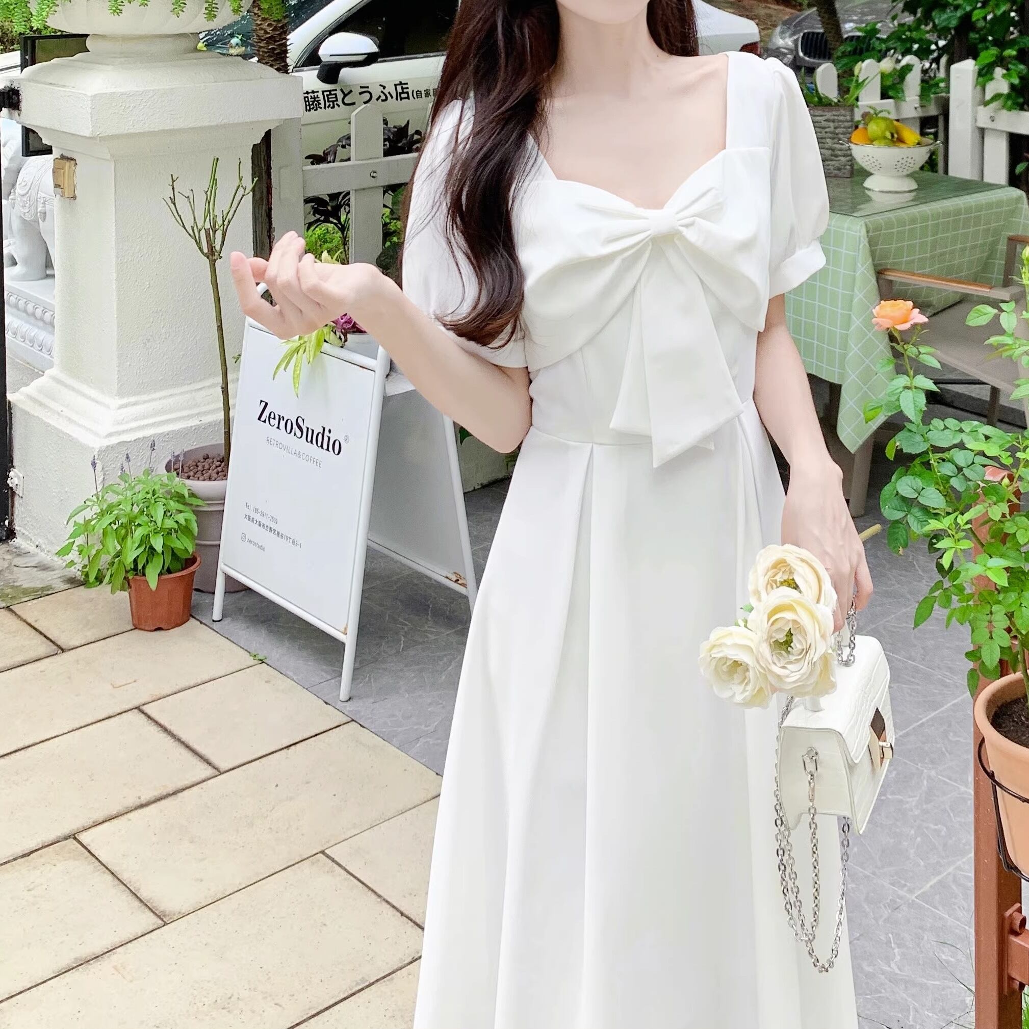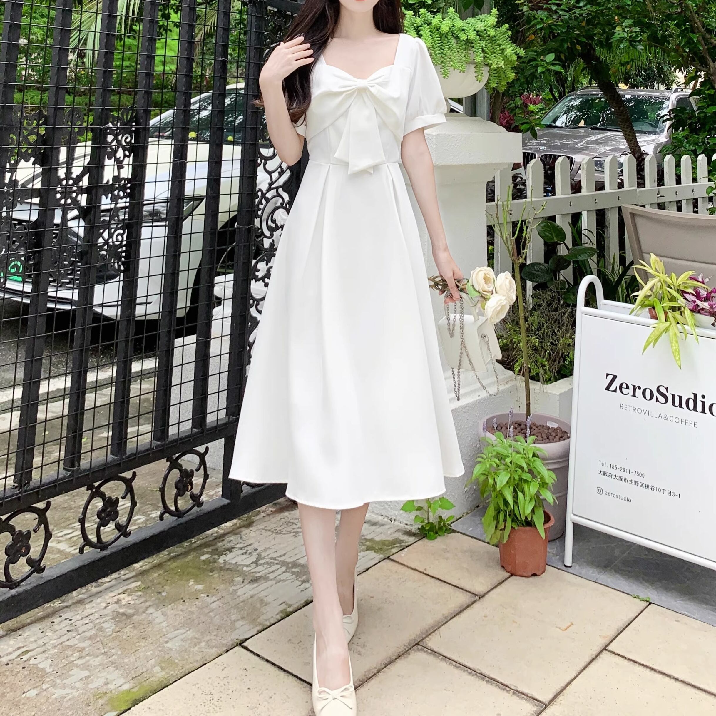 ワンピース レディース 送料無料 フレア ミモレ丈 リボン ペンタゴンネック パフスリーブ 襟なし 半袖 体型カバー シンプル 大人可愛い きれいめ お洒落 おしゃれ 大人女子 イベント デート パーティ— 女子会 休日 お出かけ ファッション コーデ かわいい 大人可愛い きれいめ シンプル 大人 上品 おしゃれ お呼ばれ 二次会 かわいい モテコーデ ベーシック かわいい インスタ トレンド ホワイト 春 夏 大きいサイズ M L XL 2XL 3XL 4XL
