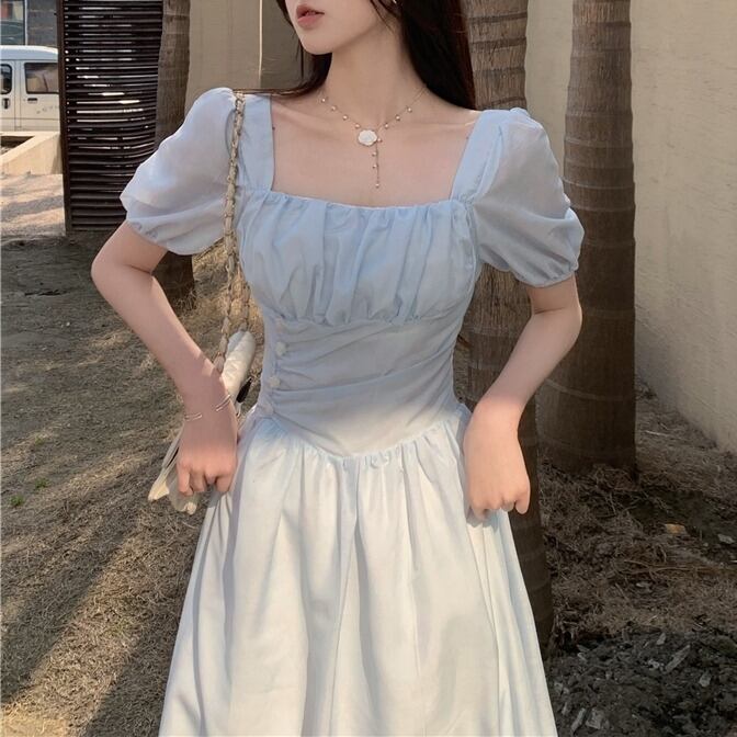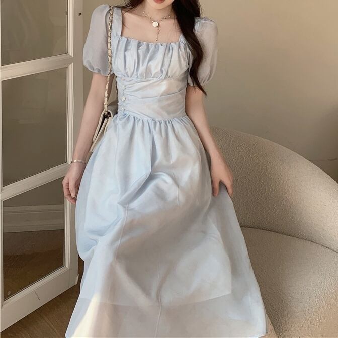 ワンピース レディース 送料無料 フレア ミモレ丈 切り替え スクエアネック パフスリーブ 襟なし 半袖 アシンメトリー ギャザー ハイウエスト 体型カバー シンプル 大人可愛い きれいめ お洒落 おしゃれ 大人女子 イベント デート パーティ— 女子会 休日 お出かけ ファッション コーデ かわいい 大人可愛い きれいめ シンプル 大人 上品 おしゃれ お呼ばれ 二次会 かわいい モテコーデ ベーシック かわいい インスタ トレンド ブルー 春 夏 大きいサイズ M L XL 2XL 3XL 4XL