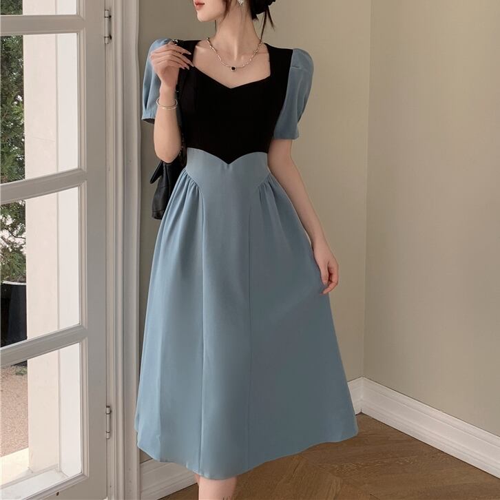 ワンピース レディース 送料無料 フレア ミモレ丈 ペンタゴンネック パフスリーブ ギャザー 襟なし バイカラー 半袖 体型カバー シンプル きれいめ お洒落 おしゃれ 大人女子 イベント デート パーティ— 女子会 休日 お出かけ ファッション コーデ かわいい 大人可愛い きれいめ シンプル 大人 上品 おしゃれ お呼ばれ 二次会 かわいい モテコーデ ベーシック かわいい インスタ トレンド ブルー 春 夏 大きいサイズ L XL 2XL 3XL 4XL