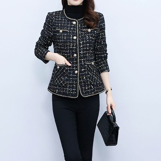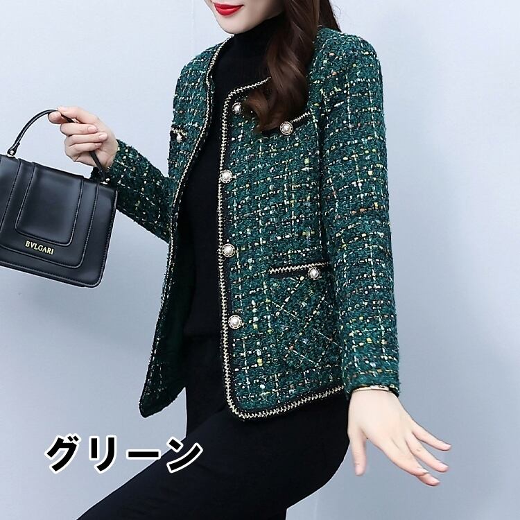 アウター レディース 送料無料 2色 ジャケット ツイード ノーカラー 縁取り トリム カラフル パールボタン クルーネック チェック パールボタン トラッド 襟なし インスタ トレンド 羽織 フェミニン パイピング モノトーン かわいい きれいめ かっこいい おしゃれ 小顔見せ 着?せ 体型カバー オフィス 通勤 OL 女子会 お出かけ イベント パーティー お呼ばれ ゆったり モテ デート レトロ ブラック グリーン L XL 2XL 3XL 4XL 5XL 大きいサイズ