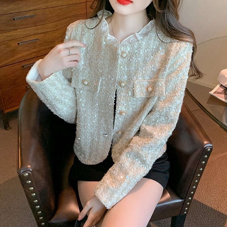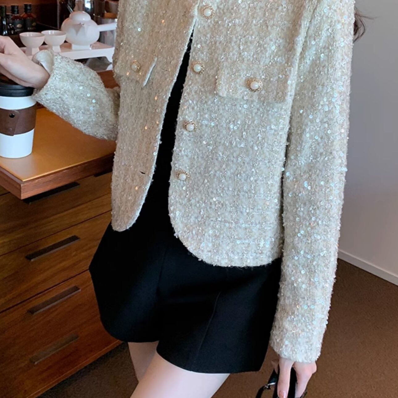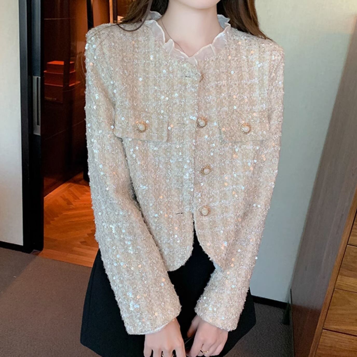 アウター レディース 送料無料 ジャケット ツイード スタンドカラー チュール スパンコール キラキラ 透け感 縁取り ラウンドヘム トリム カラフル パールボタン クルーネック パールボタン トラッド 襟なし インスタ トレンド 羽織 フェミニン モノトーン かわいい きれいめ かっこいい おしゃれ 小顔見せ 着?せ 体型カバー オフィス 通勤 OL 女子会 お出かけ イベント パーティー お呼ばれ ゆったり モテ デート レトロ ベージュ S M L XL 2XL 大きいサイズ