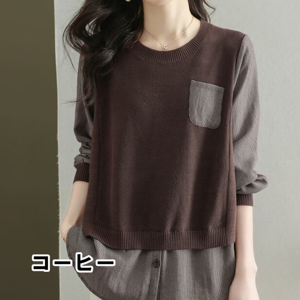 トップス レディース 送料無料 5色 シャツ ブラウス クルーネック 長袖 襟付き ニット フェイクレイヤード スリット ストライプ ポケット ラウンドヘム 重ね着 パフスリーブ ゆったり 抜け感 こなれ感 クール かっこいい 個性的 華やか 派手 無地 春 秋 冬 10代 20代 30代 普段使い 重ね着 着回し おしゃれ お洒落 ラフ カジュアル 前開き マスタード オリーブ ベージュ ブルー コーヒー 涼し 通気性 薄手 ワイド 存在感 モード系 M L XL 2XL 3XL 4XL