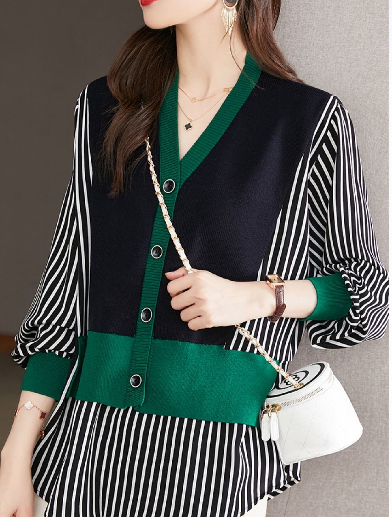 ストライプとマルチカラーのニット切り替えが異素材ミックスでコーデを華やかに。
