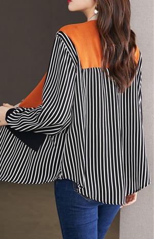 トップス レディース 送料無料 2色 シャツ ブラウス Vネック 長袖 襟付き ニット フェイクレイヤード スリット ストライプ ラウンドヘム 重ね着 パフスリーブ ゆったり 抜け感 こなれ感 クール かっこいい 個性的 華やか 派手 無地 春 秋 冬 10代 20代 30代 普段使い 重ね着 着回し おしゃれ お洒落 ラフ カジュアル 前開き イエロー ネイビー 涼し 通気性 薄手 ワイド 存在感 モード系 M L XL 2XL 3XL 4XL