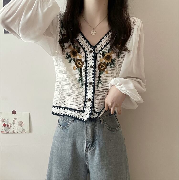 シフォンブラウスとクロシェベストがドッキングしたようなトップス。
