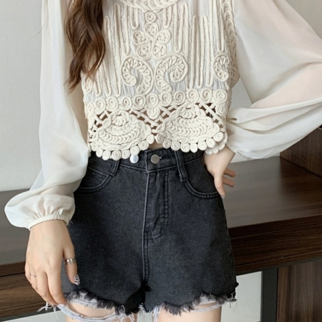 シフォンブラウスと幾何学パターンのレース装飾が存在感のあるトップス。