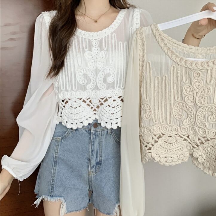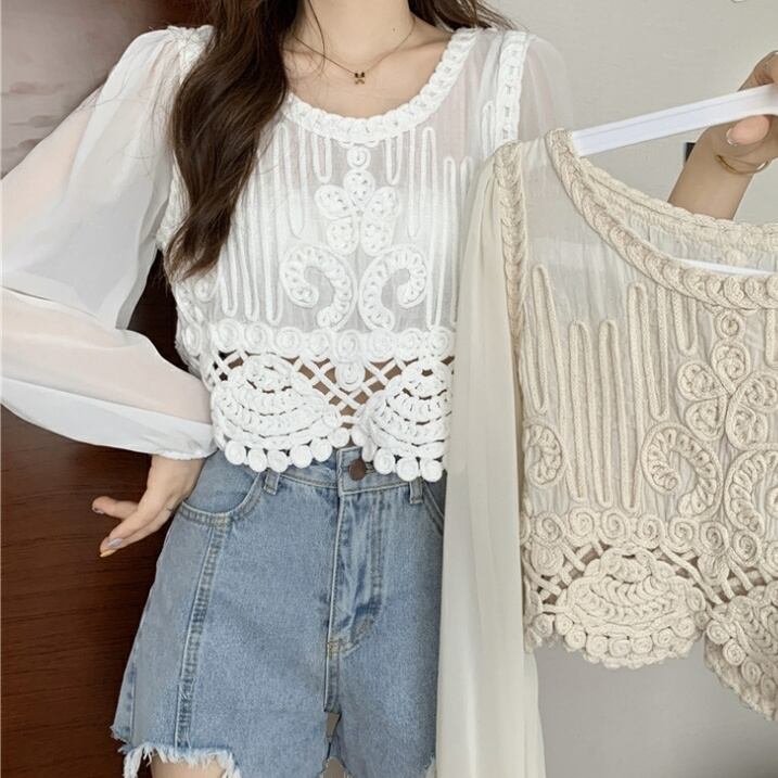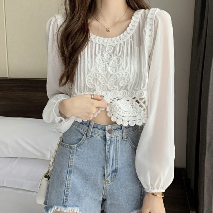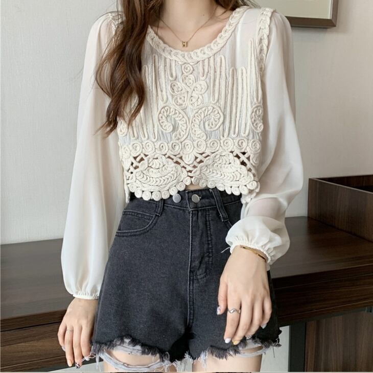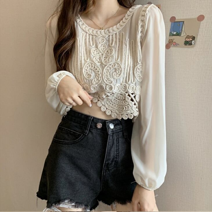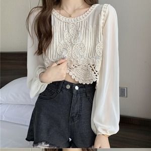 トップス レディース 送料無料 2色 プルオーバー シャツ ブラウス ラウンドネック 透け感 クロシェ ニット 幾何学 ボヘミアン レース 長袖 襟付き 異素材ミックス フェイクレイヤード ラウンドヘム 重ね着 パフスリーブ ゆったり 抜け感 こなれ感 クール かっこいい 個性的 華やか 派手 無地 春 秋 冬 10代 20代 30代 普段使い 重ね着 着回し おしゃれ お洒落 ラフ カジュアル 通気性 薄手 ワイド 存在感 モード系 アプリコット ホワイト ワンサイズ