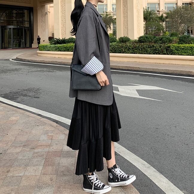 大きさの違うプリーツ切り替えデザインがモードで洗練されたデザイン。