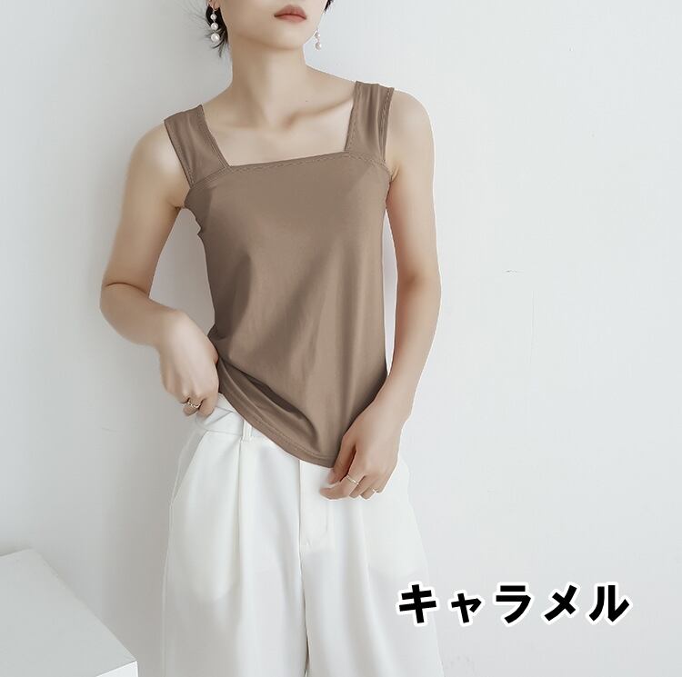 太いストラップとスクエアネックが可愛いタンクトップ。