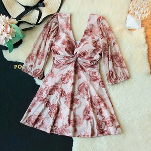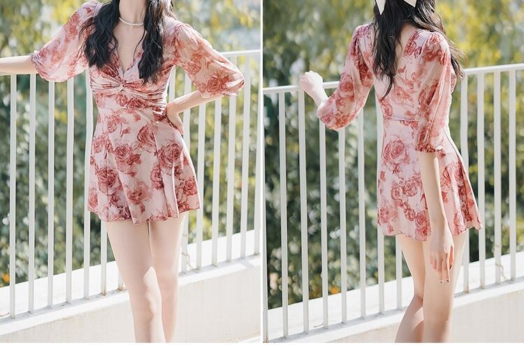 大きな薔薇プリントのシフォン生地がフェミニンなワンピース水着です。