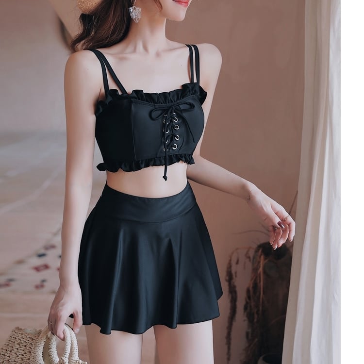 ビスチェトップのレースアップが可愛いフレアスカートとセットの水着2点セット。