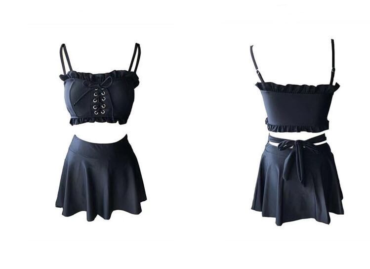 水着 レディース 送料無料 2色 ビキニ セパレート レースアップ ダブルストラップ フレアスカート レースアップ フレアスカート 2点セット 上下セット リボン キャミ フリル ハイウエスト フリル クロップ丈 ローライズ カジュアル かわいい 大人可愛い 女の子 セパレート レトロ 韓国 おしゃれ スウィート キュート ガーリー セット 海 ビーチ 川 キャンプ 温泉 プール ブラック ブルー S M L XL