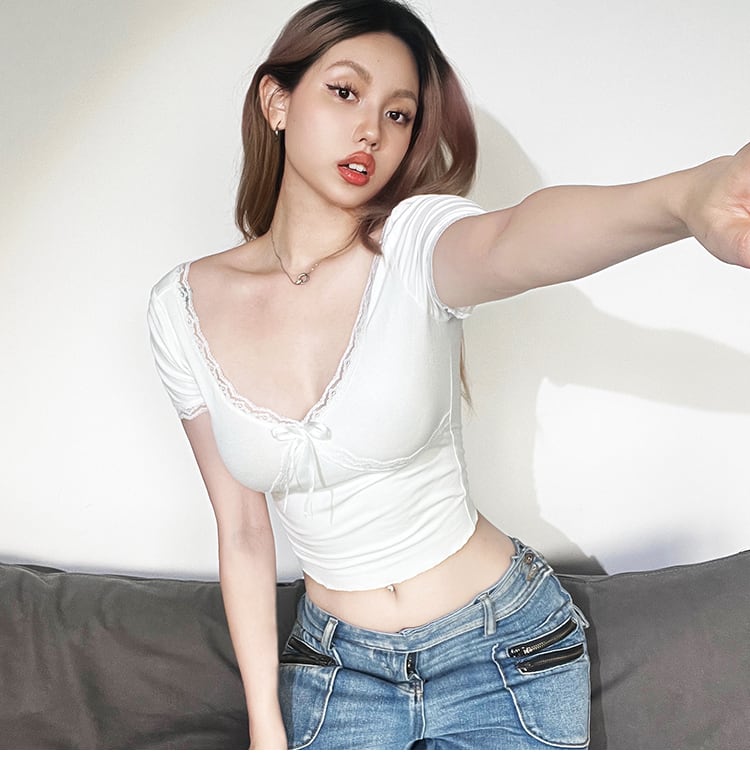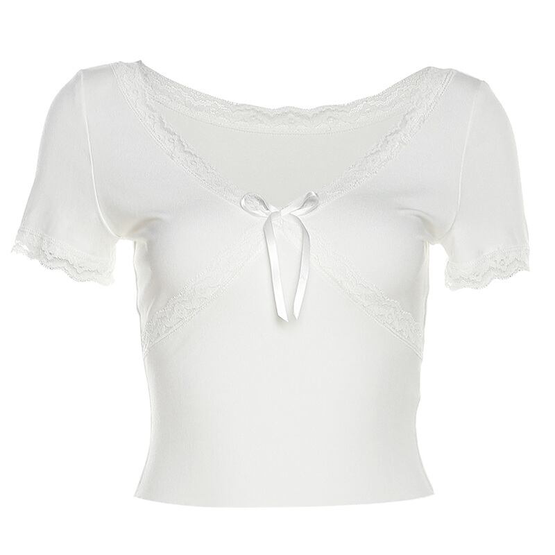 クロップドトップス リブT レディース トップス カットソー インナー Tシャツ タイト スリム 細身 ショート クロップド丈 半袖 ワイドVネック リボン リブ レーストリミング 鎖骨見せ デコルテ見せ 伸縮性 かわいい 大人可愛い きれいめ シンプル カジュアル ガーリー 抜け感 フェミニン セクシー 色気 胸元開き 無地 春 夏 女の子 デート お出かけ リゾート 旅行 海 プール ビーチ 休日 バカンス 重ね着 韓国 オルチャン コーデ 普段使い 着回し レイヤード S M L ホワイト ブラック