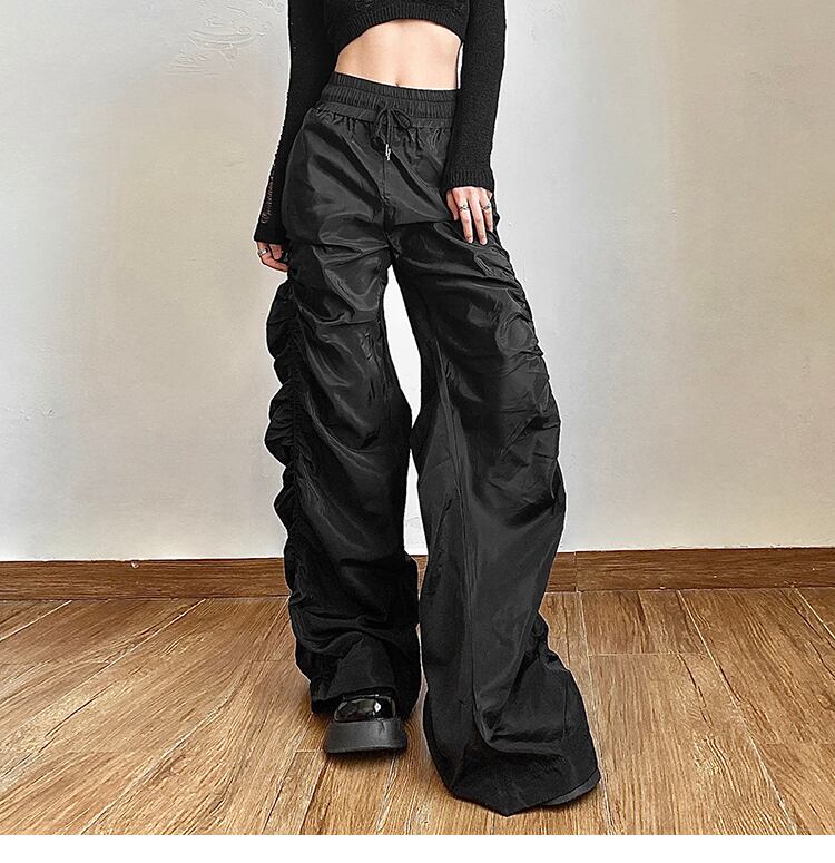 ギャザーライン ワイドレッグパンツ レディース パンツ ボトムス モップパンツ ロングパンツ ロング フルレングス プリーツ ウエストマーク ポケット ハイウエスト ドロスト 光沢感 ツヤ シンプル カジュアル おしゃれ かっこいい こなれ感 個性的 クール モード系 存在感 ストリート調 ヒップホップ ダンス衣装 無地 女の子 お出かけ イベント 発表会 ライブ フェス ステージ衣装 韓国 オルチャン 体型カバー 脚長 普段使い XS S M L 小さいサイズ ヒップゆったり 白 ホワイト 黒 ブラック