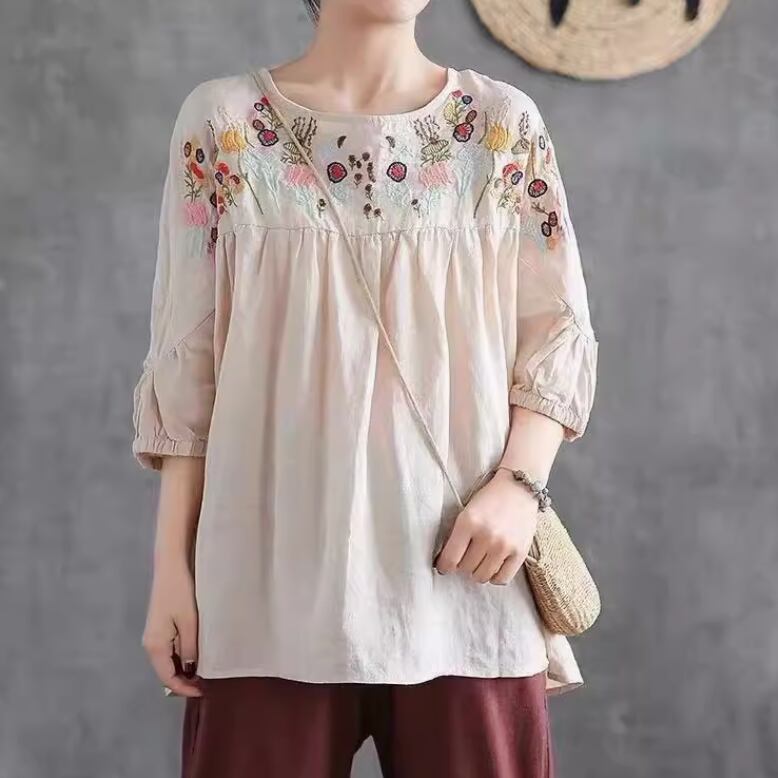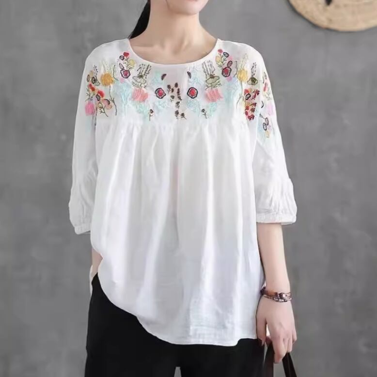 レディース トップス ブラウス プルオーバー 7分袖 ラウンドネック 襟なし ノーカラー ワイド 刺繍 薄手 かわいい 大人可愛い きれいめ シンプル カジュアル 上品 おしゃれ レトロ こなれ感 ラフ ガーリー ルーズ 個性的 エレガント 主役級 存在感 とろみ感 抜け感 ラブリー キュート ベーシック ロマンティック ナチュラル 花柄 フラワー 夏 デート お出かけ リゾート 旅行 公園 女子会 休日 バカンス カフェ コーデ 楽ちん 体型カバー 普段使い モテ 清楚 L XL 2XL ゆったり ゆる