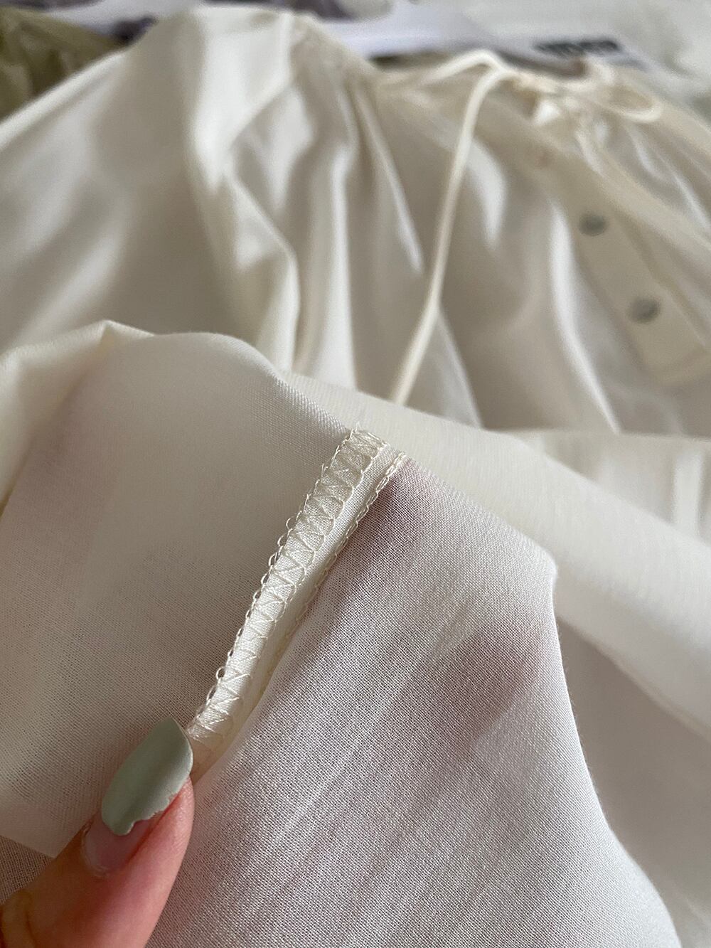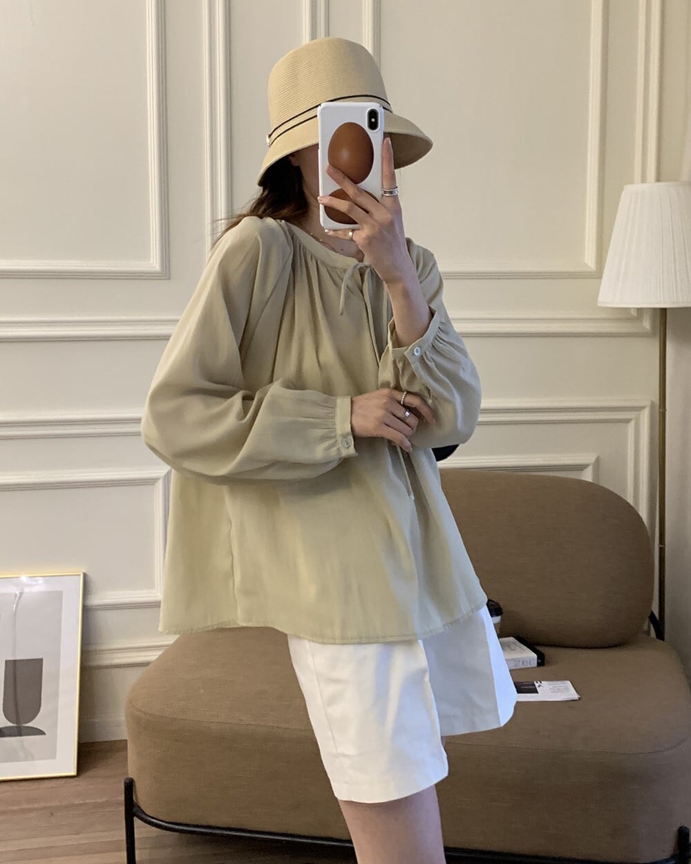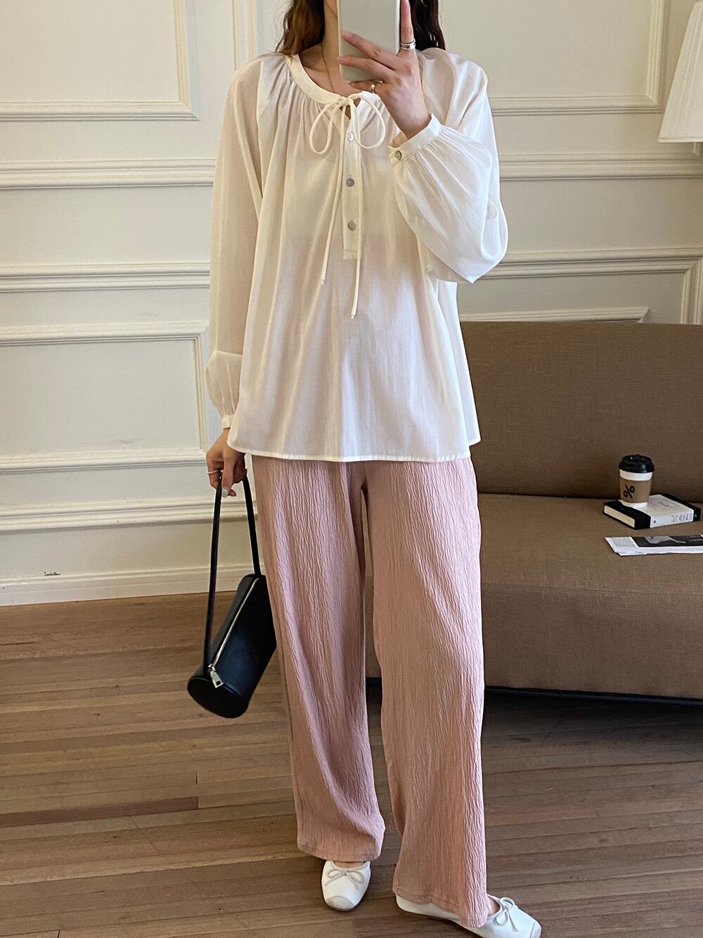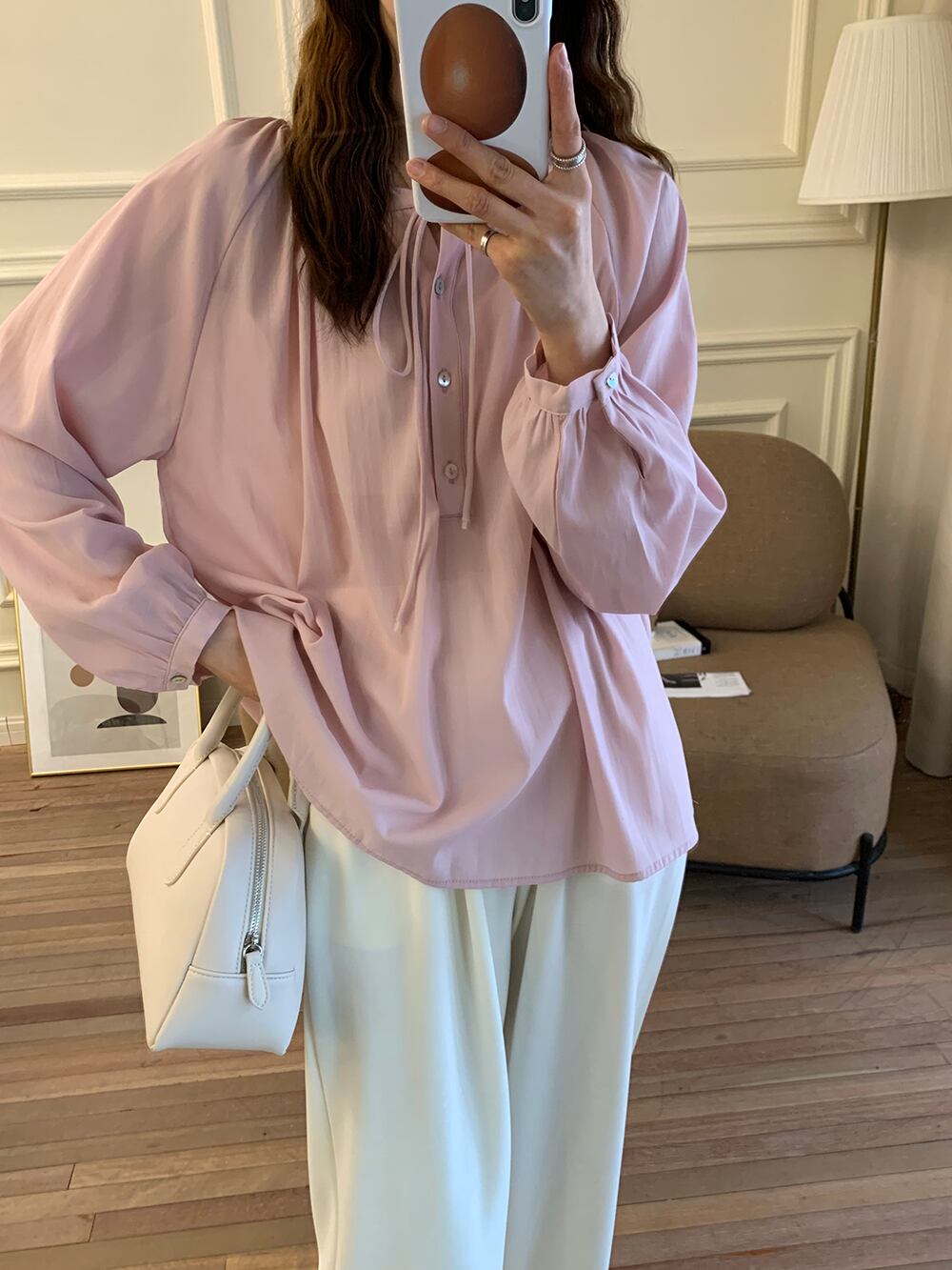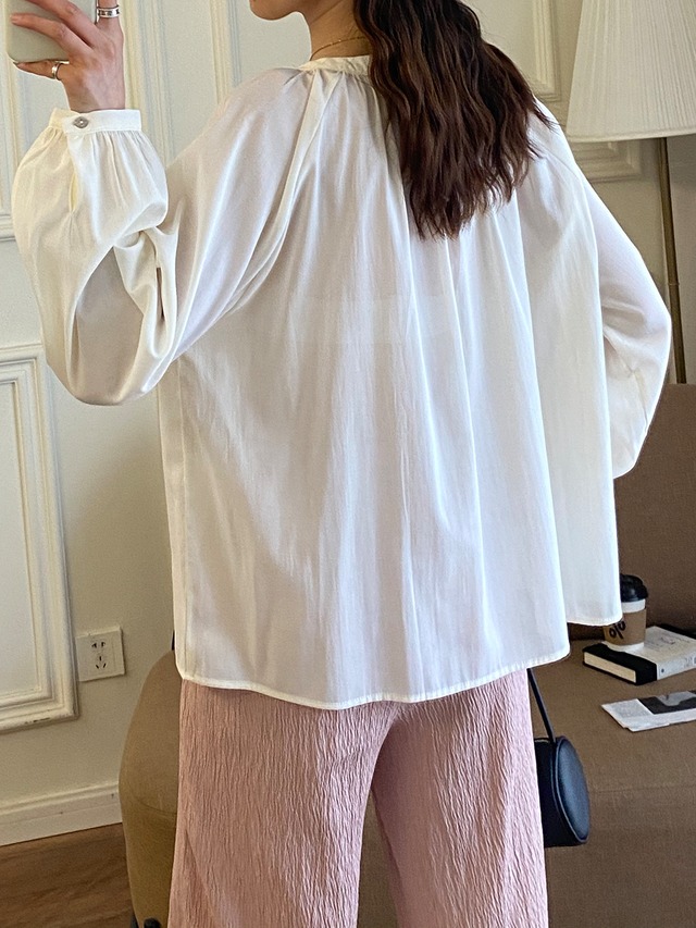 ゆるっとオーバーサイズでリラックス感のある着こなしが楽しめるギャザーブラウスです。首元でリボンを結ぶヘンリーネックデザインで着脱しやすく、パフスリーブやほのかな透け感・シェルボタン等女性らしいディテールをちりばめた上品なデザイン。自然に体型カバーしながらで大人可愛く決まり、こなれコーデが叶うアイテムです。