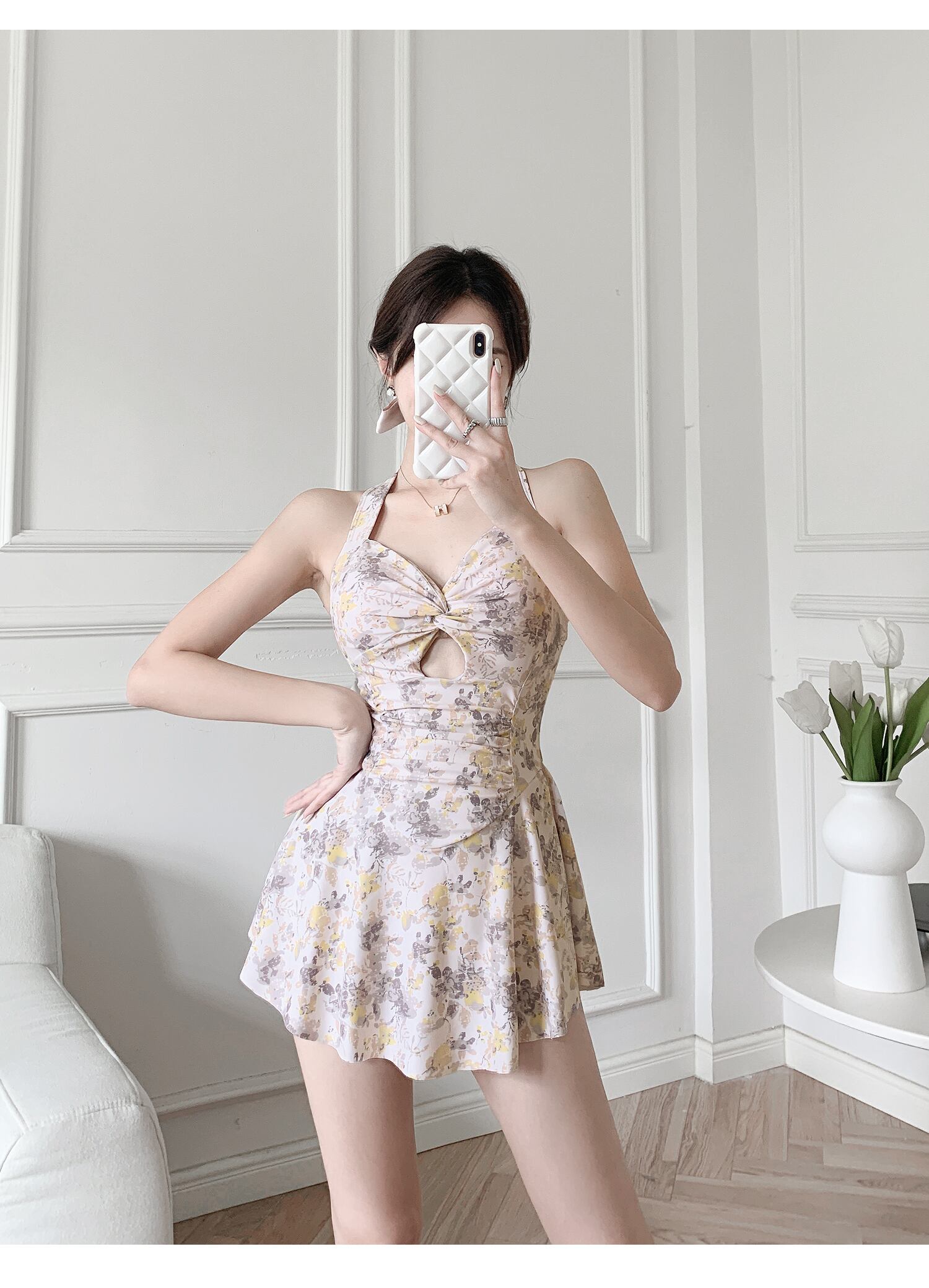 水着 レディース 送料無料 2色 ビキニ ワンピース フリル スカート デコルテ カットアウト 花柄 フレア ホルターネック ノースリーブ ノット リボン ギャザー フレアスカート 2点セット パンツ付き 上下セット リボン キャミ フリル ハイウエスト クロップ丈 ローライズ カジュアル かわいい 大人可愛い 女の子 セパレート レトロ 韓国 おしゃれ スウィート キュート ガーリー セット 海 ビーチ 川 キャンプ 温泉 イエロー ブルー M L XL