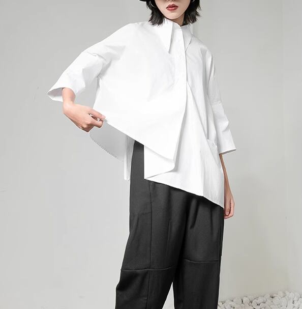 レディース トップス シャツ 5分袖 襟付き オーバーサイズ アシンメトリー ポケット かわいい 大人可愛い シンプル カジュアル おしゃれ メンズライク マニッシュ ボーイッシュ 個性的 クール 存在感 かっちり ベーシック 無地 春 夏 秋 ロングシーズン 学生 お出かけ イベント 女子会 休日 ショッピング コンサート ライブ カフェ 韓国 オルチャン コーデ プレゼント プチプラ 普段使い 着回し インスタ映え M L ゆったり ゆる 白 ホワイト ベーシックカラー