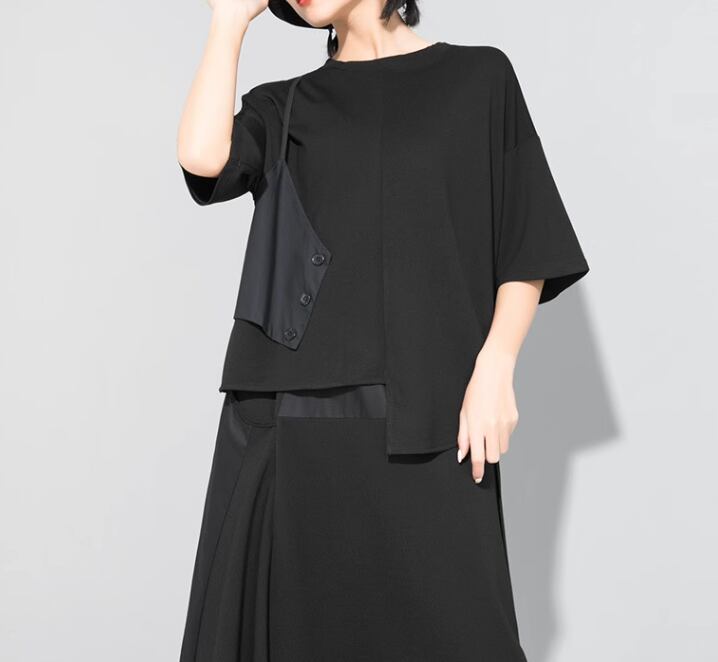 イレヘムトップス レディース トップス シャツ カットソー プルオーバー 半袖 ラウンドネック 襟なし 重ね着風 かわいい 大人可愛い きれいめ シンプル 上品 おしゃれ かっこいい こなれ感 個性的 クール モード系 エレガント 存在感 都会的 無地 春 夏 秋 ロングシーズン 授業参観 デート お出かけ イベント 女子会 休日 ホテル ショッピング カフェ 婚活 楽ちん プチプラ 普段使い 着回し インスタ映え ゆったり ゆる フリーサイズ 黒 ブラック ベーシックカラー 大人カラー