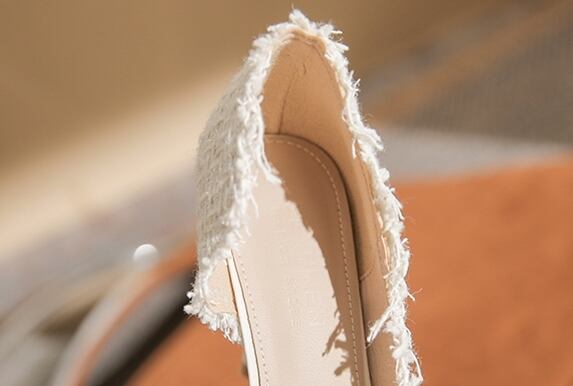 ツイードの端をラフに整えたフリンジ調こなれたピンヒールパンプス。