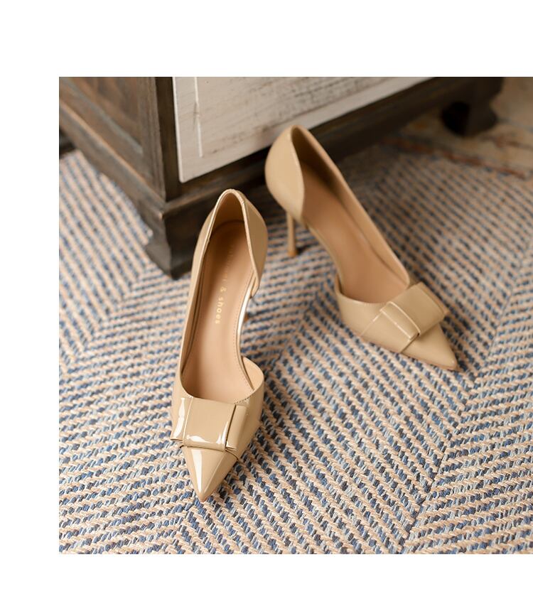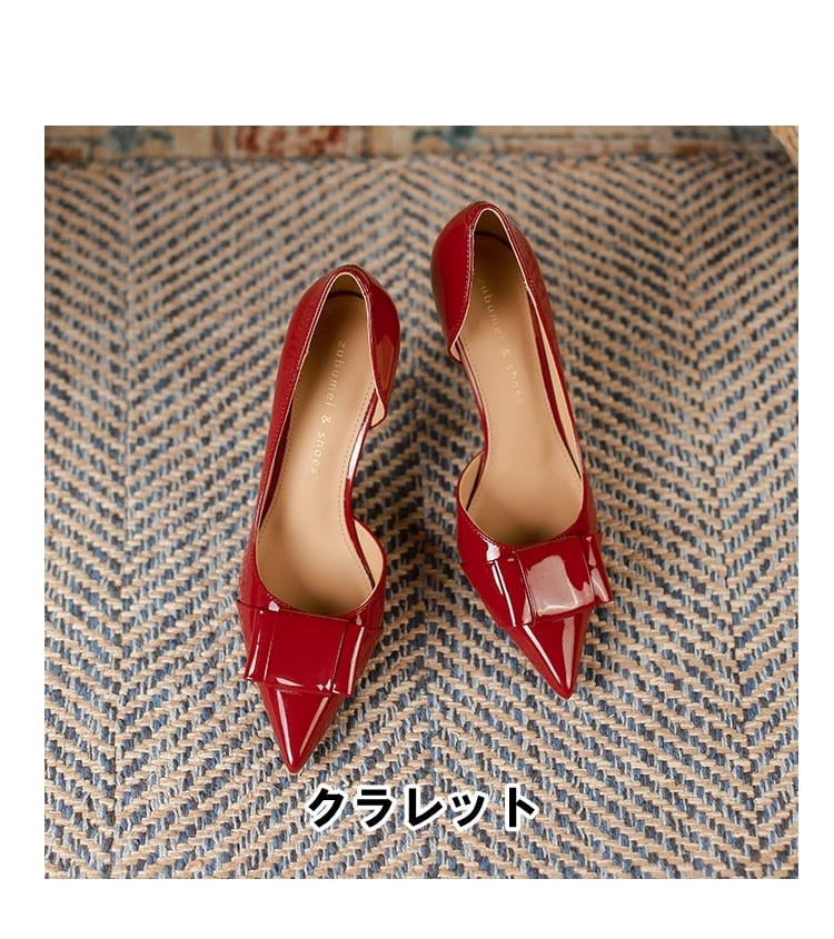 大人可愛いスクエア型のリボン付きポインテッドトゥハイヒールパンプス。