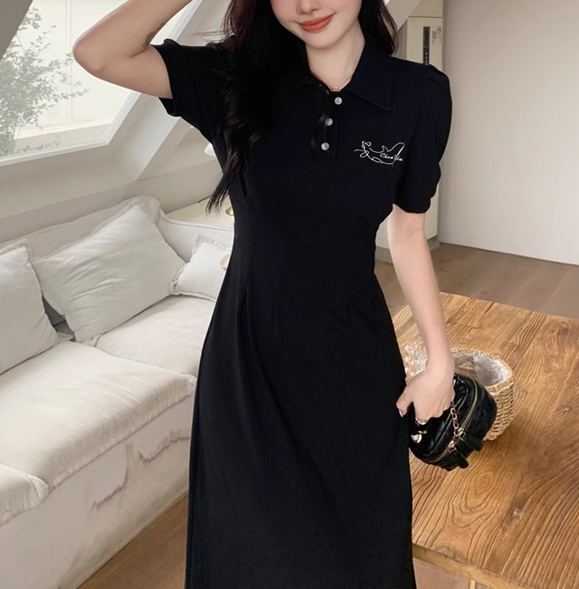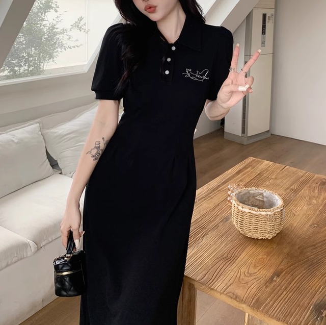ポロシャツワンピ レディース ワンピース ロング 半袖 パフスリーブ 襟付き 背中開き リボン ウエストマーク バックリボン かわいい シンプル カジュアル おしゃれ スポーティー ガーリー 存在感 ラブリー キュート アクティブ ロゴ 春 夏 秋 ロングシーズン 学生 デート お出かけ イベント 女子会 休日 ショッピング コンサート カフェ 韓国 オルチャン プレゼント 体型カバー 脚長 プチプラ 普段使い 着回し モテ インスタ映え L XL 2XL 3XL 4XL 大きいサイズ 黒 ブラック