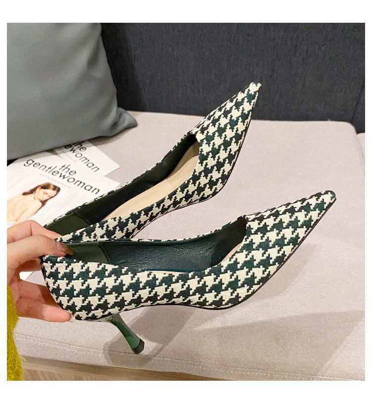 レトロな千鳥格子パターンが映えるポインテッドトゥのおしゃれなパンプス。