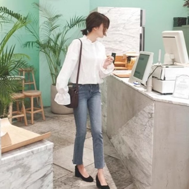 フェミニンな印象の襟フリルブラウスです。袖口がフレアのキャンディスリーブデザインがポイントで、ゆっための着心地で体型カバー効果もあり。重ね着やレイヤードスタイルにもおすすめで、襟や袖口をのぞかせてコーデに可愛らしさをプラスできます。普段使い~おすすめまで幅広く活躍し、清楚な印象やこなれ感を出したい方におすすめのアイテムです。
