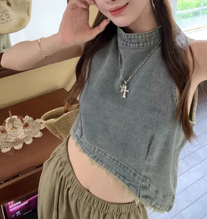 レディース トップス クロップド丈 袖なし ノースリーブ 襟なし アメカジ デニム ブルーデニム かわいい カジュアル おしゃれ かっこいい ラフ ガーリー 個性的 クール 存在感 ヴィンテージ ラブリー キュート アクティブ ワイルド 無地 春 夏 秋 学生 デート お出かけ 公園 女子会 休日 ショッピング コンサート ライブ 重ね着 韓国 オルチャン コーデ 脚長 プチプラ 普段使い 着回し モテ インスタ映え S M L 小さいサイズ 大きいサイズ ブルー