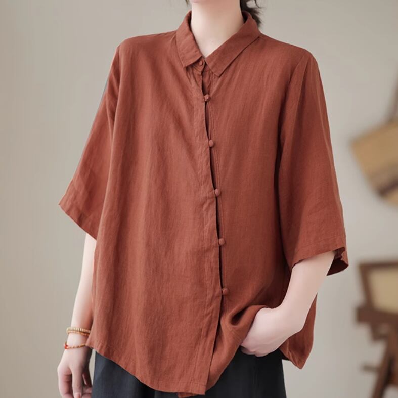 リネン素材とレトロな斜めデザインが特徴のレディースシャツ