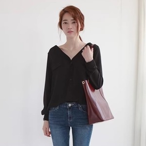 デコルテや鎖骨を美しく際立たせるVネックの長袖ブラウスです。胸元のフラップデザインがポイントで、女性らしくほんのりセクシーさもある着こなしに。前開きデザインで着脱しやすく、気取らずこなれたスタイルが楽しめます。色々なボトムと合わせやすく着回し力抜群のアイテムです。