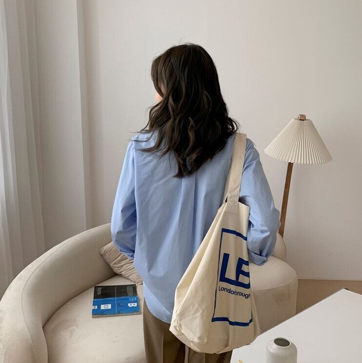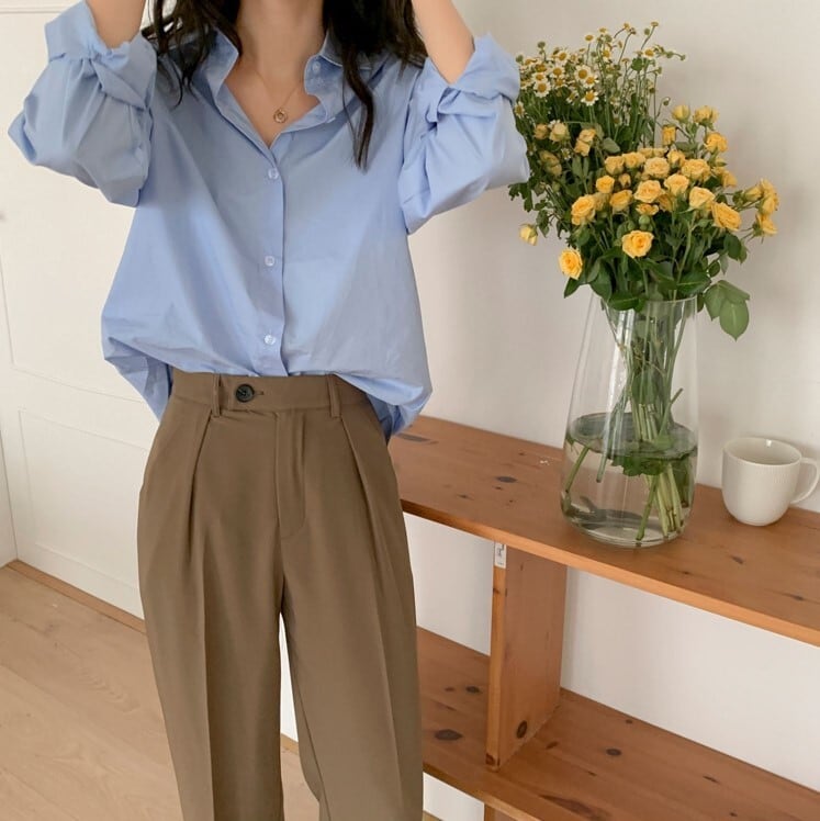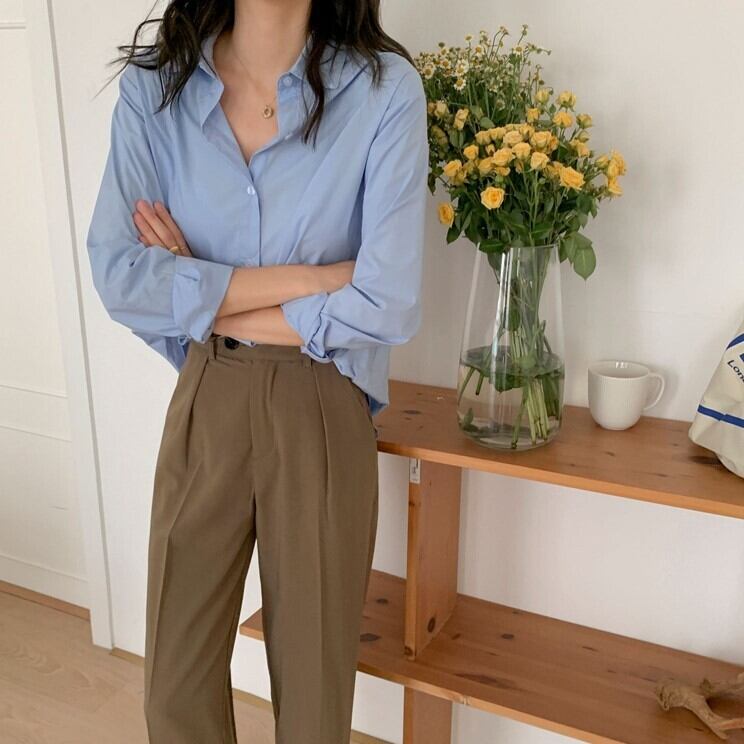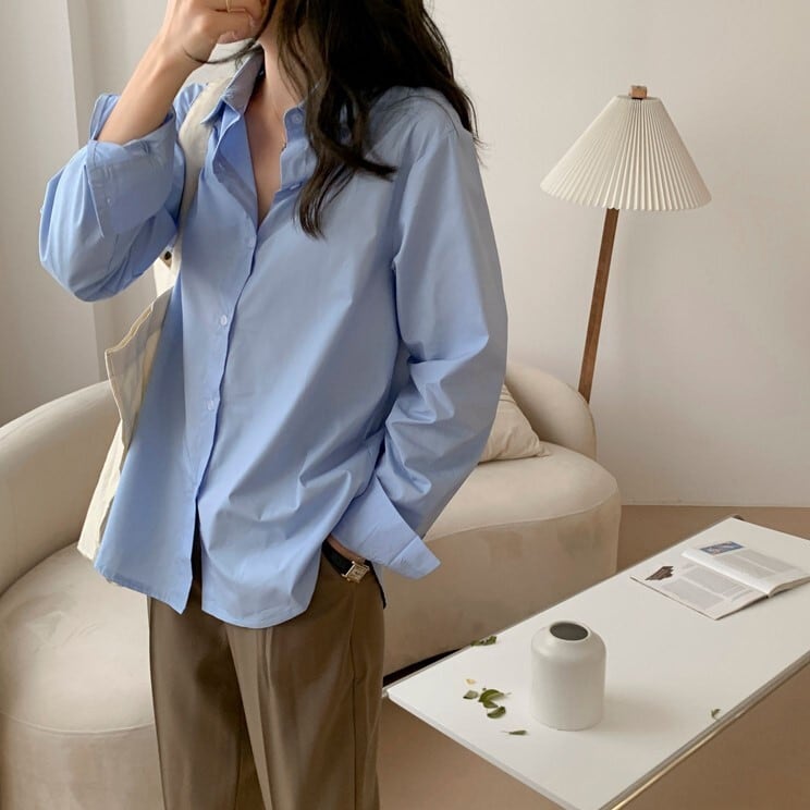 ややオーバーサイズ寄りのゆったりめシルエットが特徴の、爽やかなブルーのブラウスです。後ろ裾が前より少し長めのアンバランスヘムデザインで丈感もやや長めなので、裾を出して着ると自然な体型カバー効果あり。気取らずこなれた着こなしが叶い、1枚で・重ね着で・羽織ってと季節を問わず活躍するアイテムです。