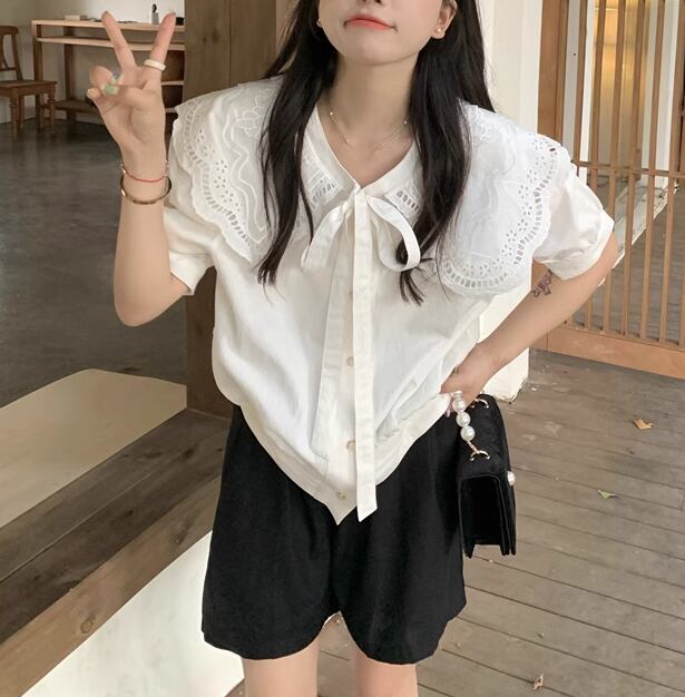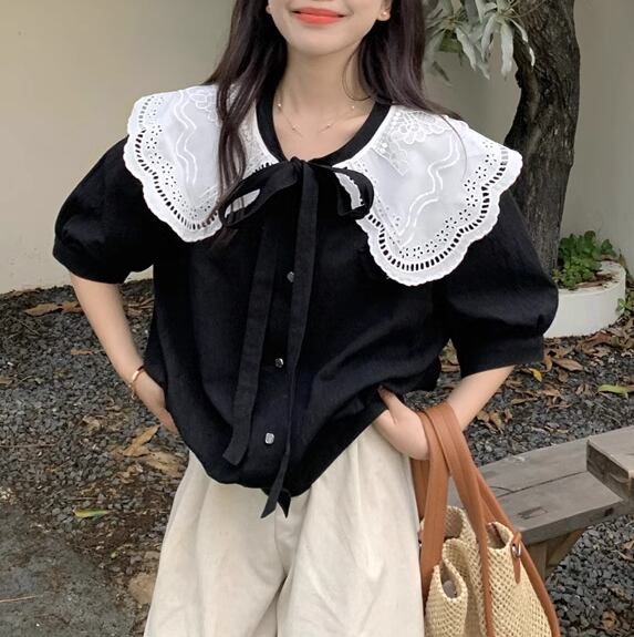 レディース トップス ブラウス 半袖 襟付き 大きめ襟 レース リボン かわいい おしゃれ ガーリー 存在感 ラブリー キュート ロマンティック フェミニン 無地 春 夏 秋 ロングシーズン 学生 デート お出かけ イベント 女子会 休日 ショッピング コンサート ライブ お花見 カフェ 韓国 オルチャン プチプラ 普段使い 着回し モテ 清楚 インスタ映え M L XL 2XL 3XL 4XL 大きいサイズ 白 ホワイト 黒 ブラック ベーシックカラー 春カラー