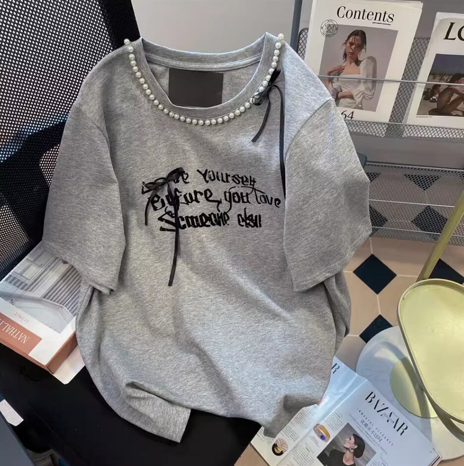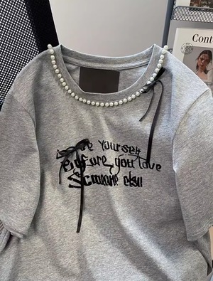 レディース トップス カットソー Tシャツ 半袖 ラウンドネック 襟なし リボン パール かわいい シンプル カジュアル おしゃれ ラフ ガーリー 存在感 ラブリー キュート ベーシック アクティブ リラックス ロゴ 春 夏 秋 ロングシーズン 学生 デート お出かけ アウトドア 公園 女子会 休日 ショッピング コンサート ライブ お花見 カフェ 韓国 オルチャン 楽ちん プチプラ 普段使い 着回し インスタ映え 定番 M L XL 2XL 大きいサイズ 白 ホワイト グレー ベーシックカラー