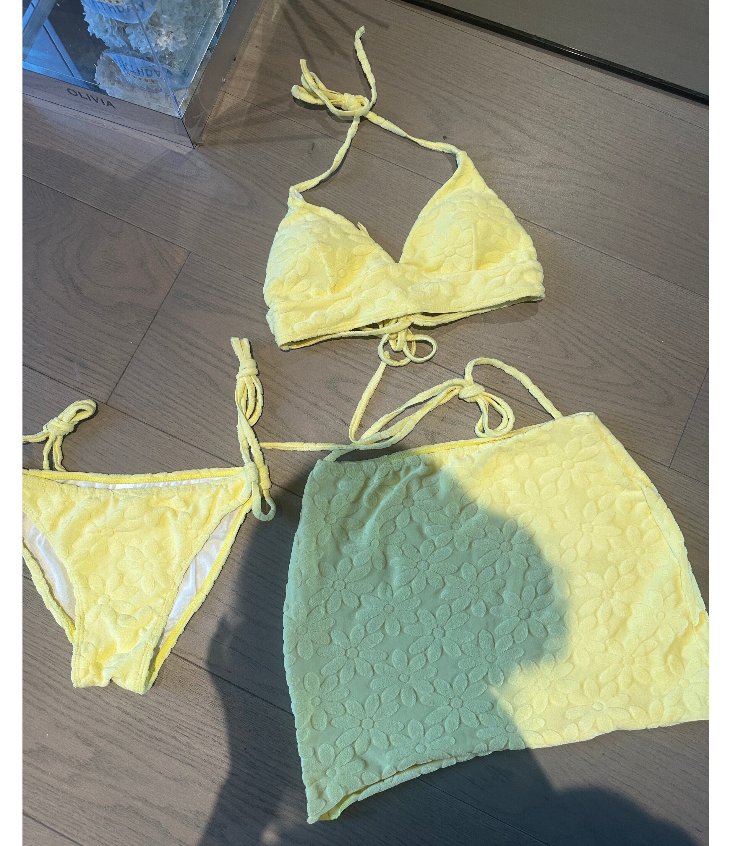 タオル地 水着 ビキニ スイムウェア レディース 紐 ホルターネック ノンワイヤー パッド付き クリスクロス バックコンシャス スリーピース 上下セット 3点セット かわいい 大人可愛い きれいめ シンプル カジュアル おしゃれ お洒落 レトロ キュート ガーリー 個性的 セクシー エンボス 花柄 リゾート 旅行 温泉 プール 夏 海 スパ くびれ見せ 脚長 着痩せ スタイルアップ 韓国 モテ 背中見せ 体型カバー インスタ映え おへそ見せ S M L カスタード ローズレッド イエロー 黄色 ピンク