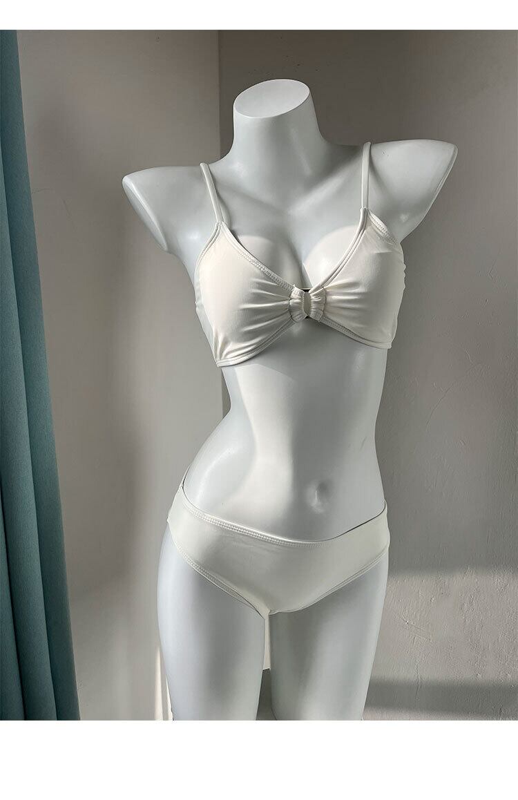 ベーシックなビキニに、アシンメトリーなティアードスカートとノットのリボン付きブラウストップス付き。