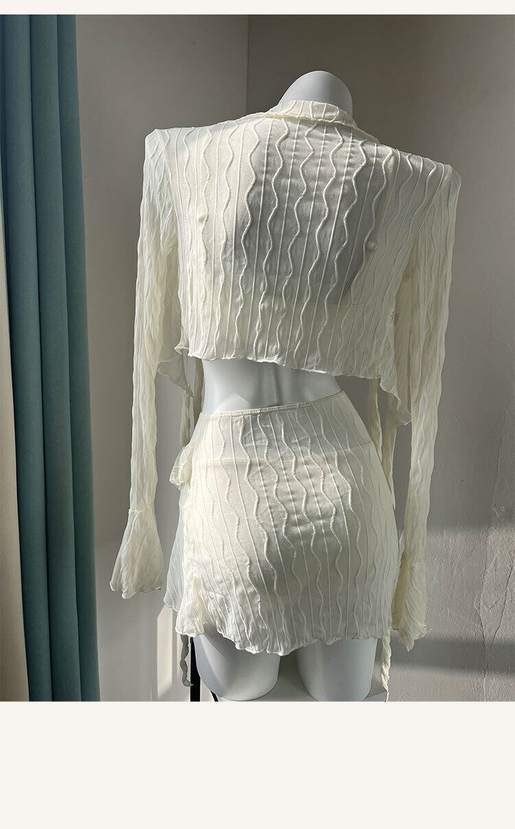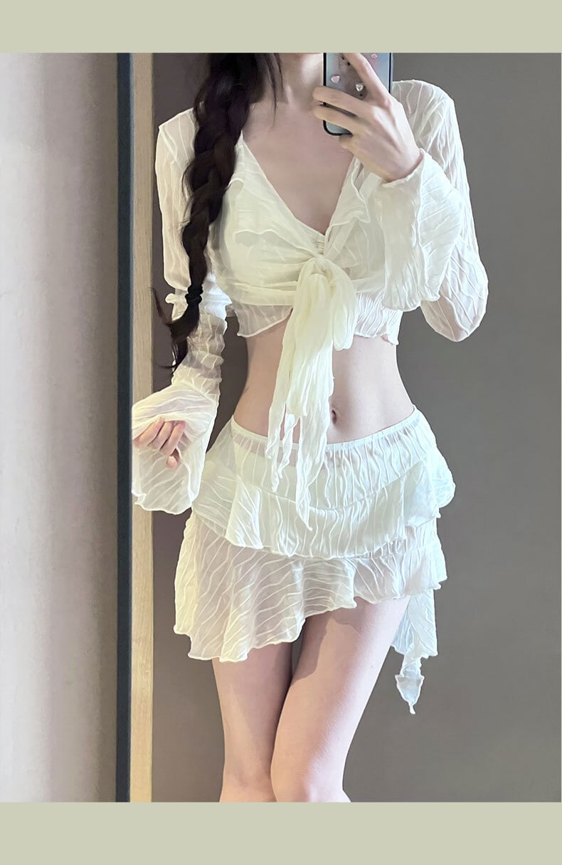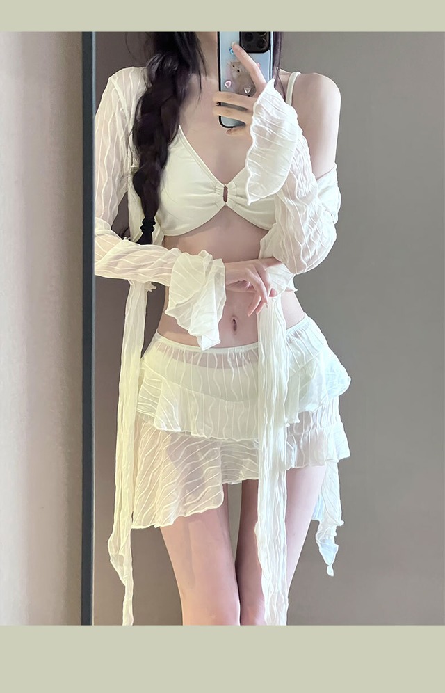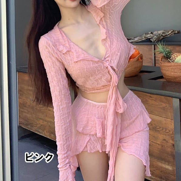 セットアップ水着 ビキニ 4点セット スカート ティアード 透け感 トップス カーディガン 幾何学模様 シフォン 透け感 ロングスリーブ フリル リボン アシンメトリー Vネック 送料無料 レディース 上下セット ブラウス 長袖 スカート 大人可愛い きれいめ 大人女子 エレガント 肌見せ デコルテ 無地 春 夏 ガーリー 10代 20代 30代 大人 学生 着回し ファッション デート コーディネート 重ね着 休日 メンズウケ シンプル スタイル ゆったり M L XL ホワイト ブラック ピンク