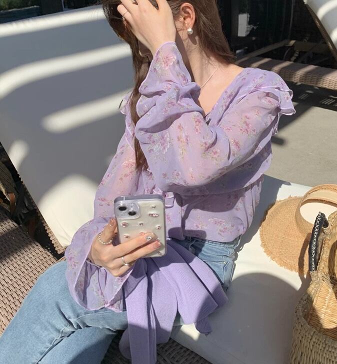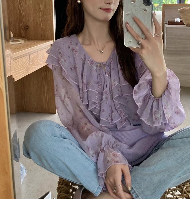レディース トップス シャツ ブラウス 長袖 ベルスリーブ Vネック 襟なし フレア 透け感 薄手 かわいい 大人可愛い きれいめ 上品 おしゃれ ガーリー エレガント 存在感 抜け感 ロマンティック フェミニン 花柄 フラワー 総柄 春 夏 秋 ロングシーズン 学生 デート お出かけ イベント 女子会 休日 ホテル ショッピング コンサート ライブ お花見 カフェ 韓国 オルチャン プレゼント プチプラ 普段使い 着回し モテ 清楚 インスタ映え フリーサイズ 春カラー パープル