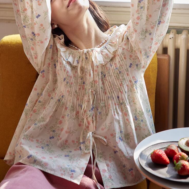 レディース トップス シャツ ブラウス 長袖 ラウンドネック 襟付き リボン 薄手 かわいい 上品 おしゃれ ガーリー 存在感 抜け感 ラブリー キュート クラシカル ロマンティック フェミニン 花柄 フラワー 総柄 春 夏 秋 ロングシーズン 学生 デート お出かけ イベント 女子会 休日 ホテル ショッピング コンサート ライブ お花見 カフェ 韓国 オルチャン プレゼント プチプラ 普段使い 着回し モテ 清楚 インスタ映え S M L 小さいサイズ 大きいサイズ アプリコット 春カラー