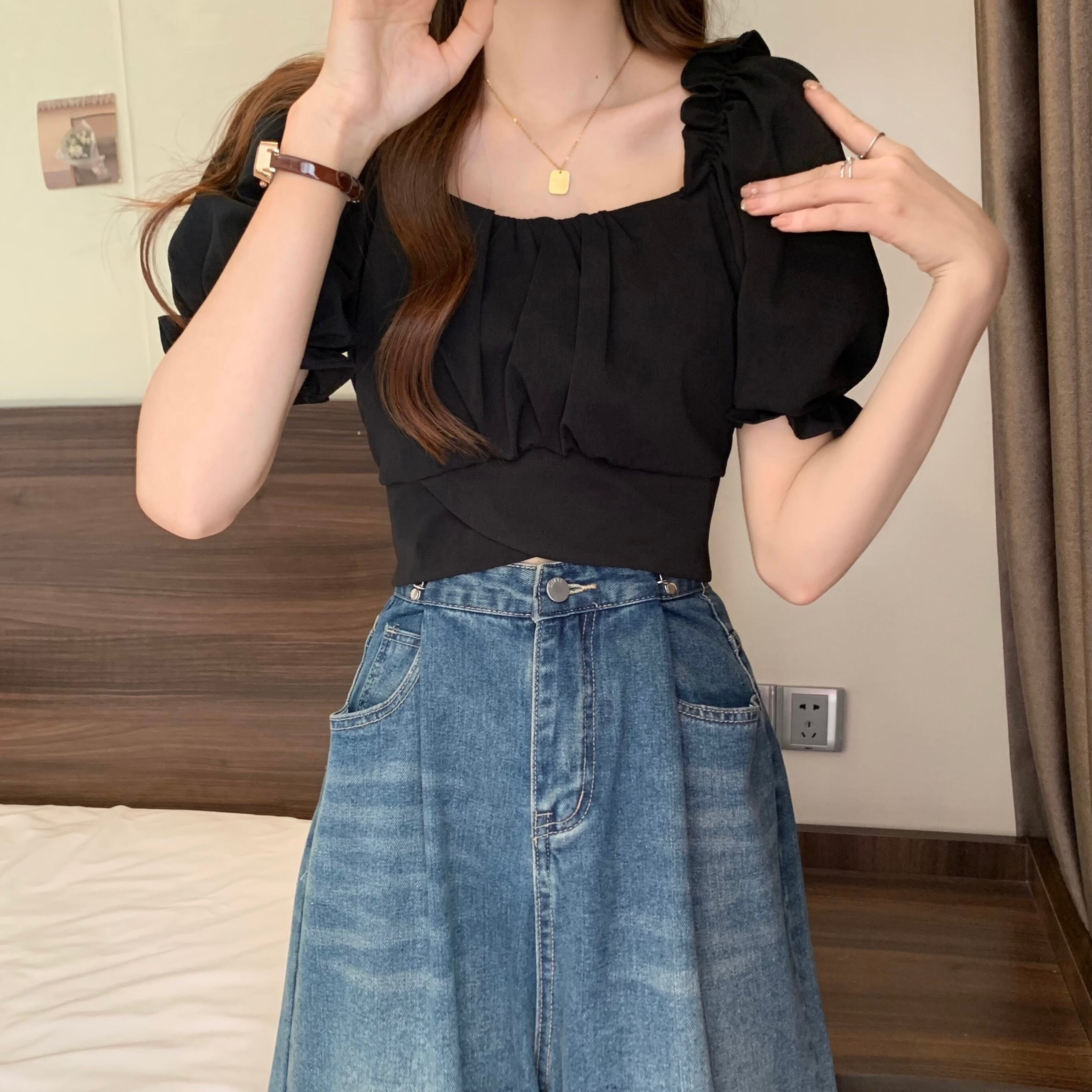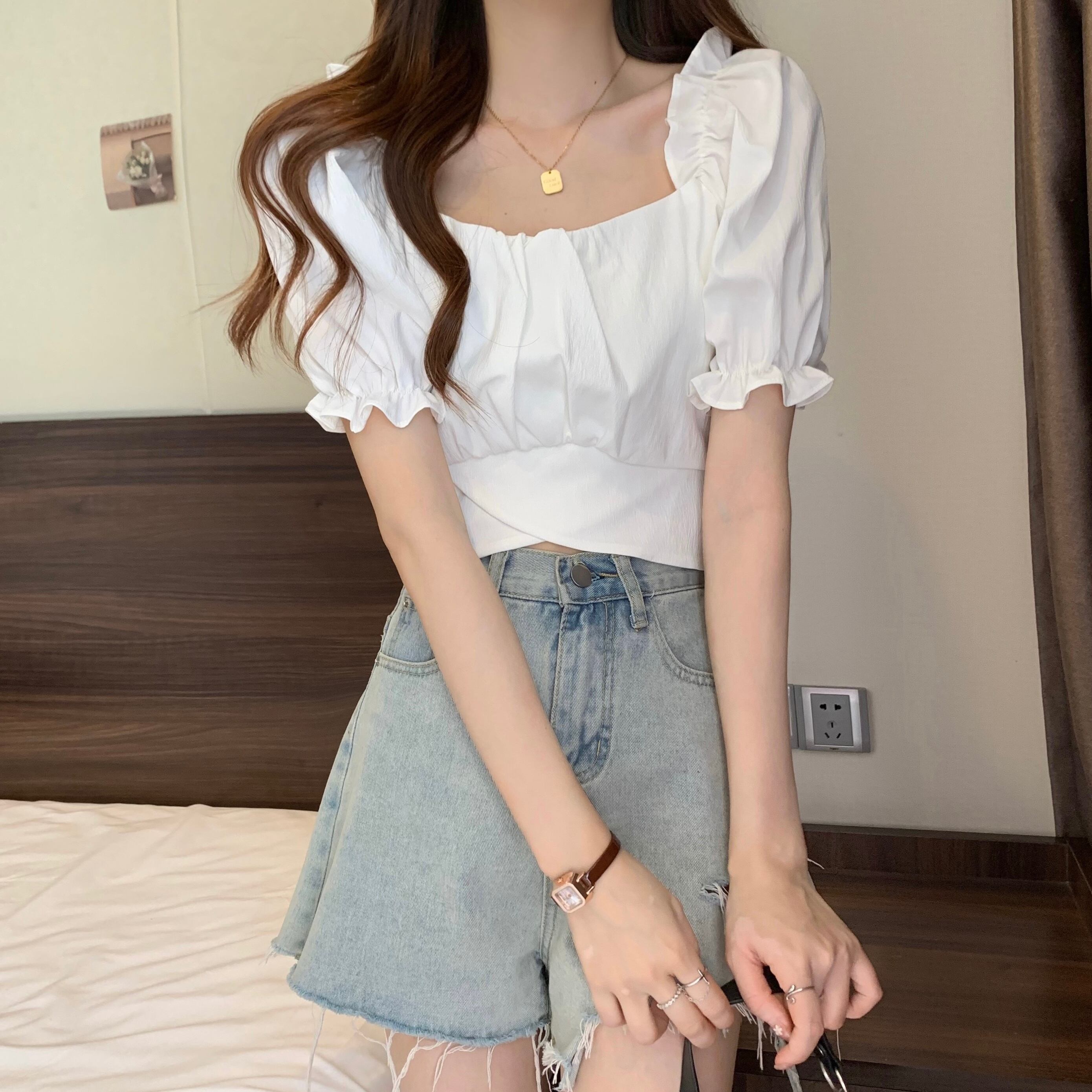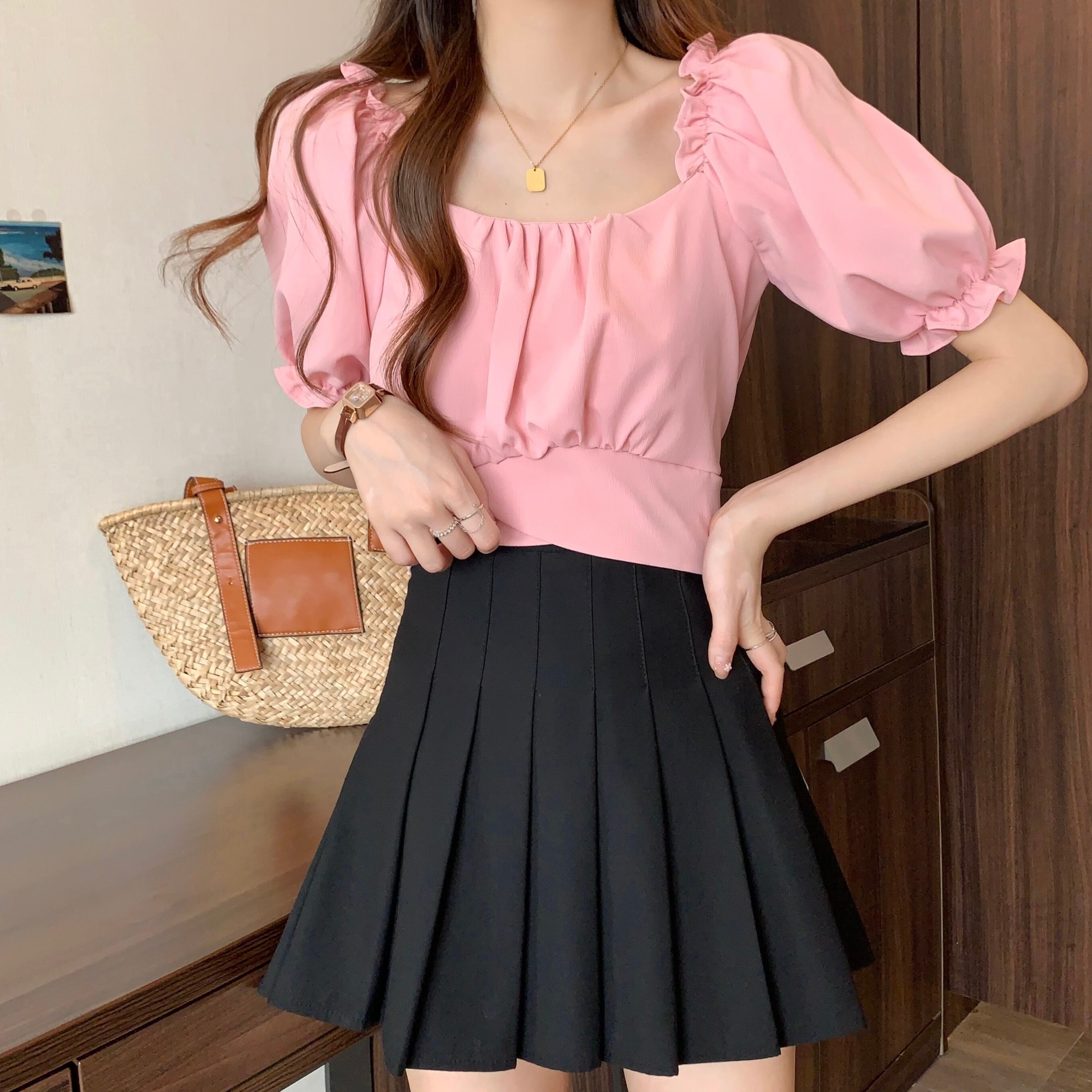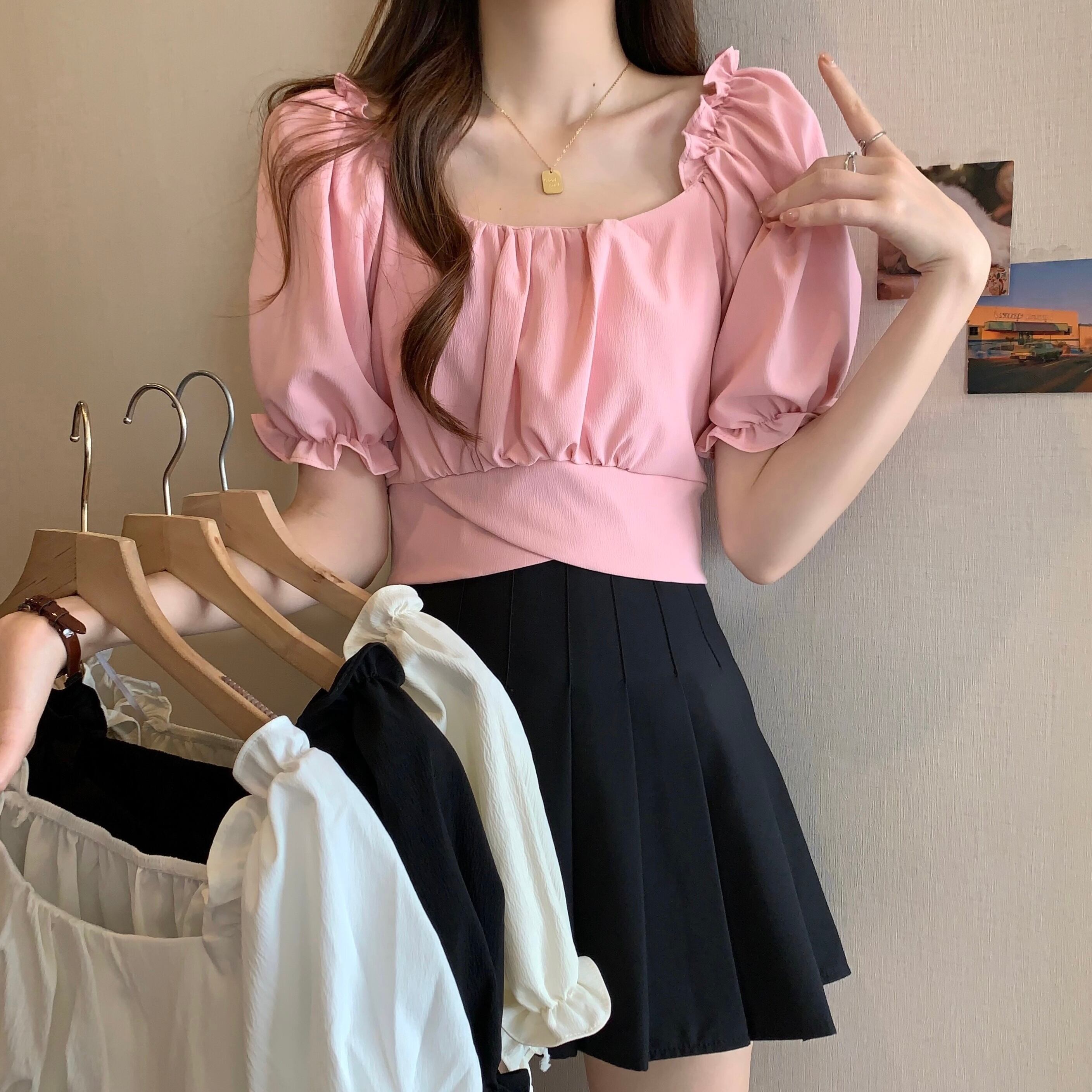 裾クロスデザイン クロップドトップス レディース トップス ブラウス タイト スリム 細身 ショート 半袖 パフスリーブ 袖口ギャザー スクエアネック タック バックリボン バックコンシャス 背中開き かわいい 大人可愛い きれいめ シンプル カジュアル おしゃれ こなれ感 ガーリー ロマンティック セクシー デコルテ見せ 鎖骨見せ 無地 春 夏 女の子 デート お出かけ リゾート 旅行 ビーチ 休日 バカンス 韓国 オルチャン 脚長 普段使い モテ S M L ホワイト ブラック ベージュ ピンク