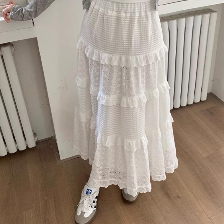 レディース スカート ロングスカート レーススカート ロング Aライン フェミニン レース フリル ハイウエスト レースアップ 透け感 薄手 かわいい 大人可愛い きれいめ シンプル カジュアル 上品 おしゃれ レトロ アジアン こなれ感 ラフ ガーリー ルーズ 個性的 エレガント モダン 主役級 存在感 とろみ感 抜け感 ラブリー キュート ベーシック ロマンティック ナチュラル 夏 デート お出かけ リゾート 女子会 休日 ショッピング お花見 コーデ 脚長 普段使い モテ 清楚 S M L ホワイト