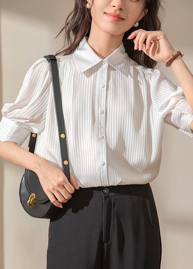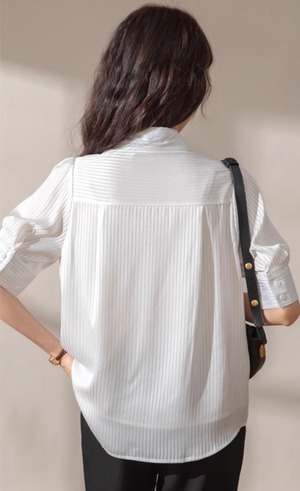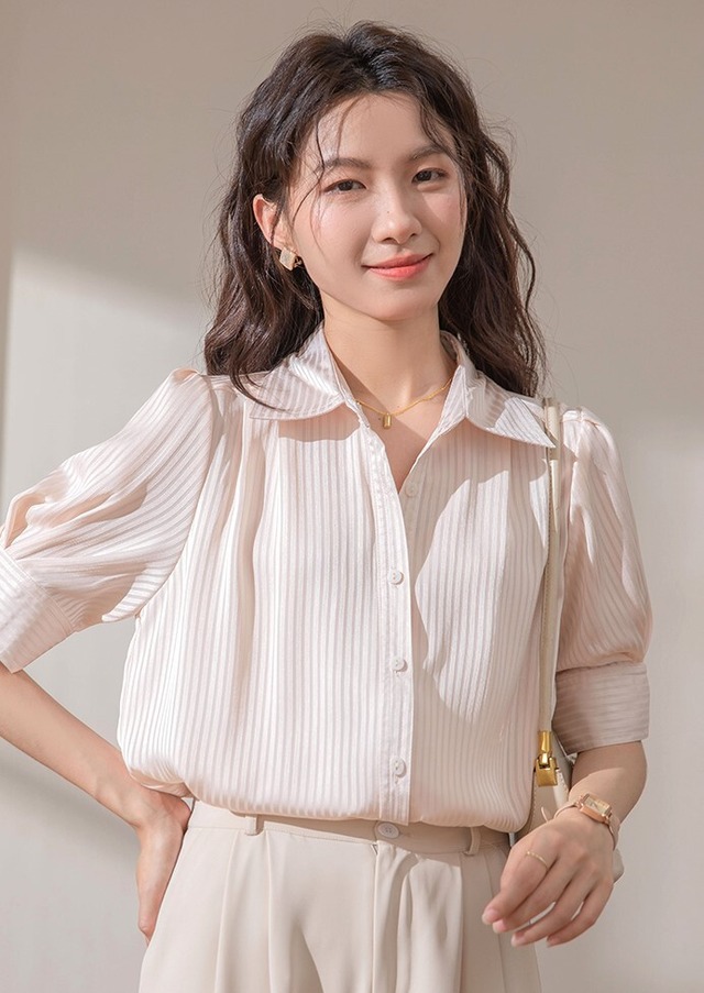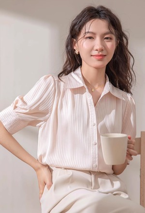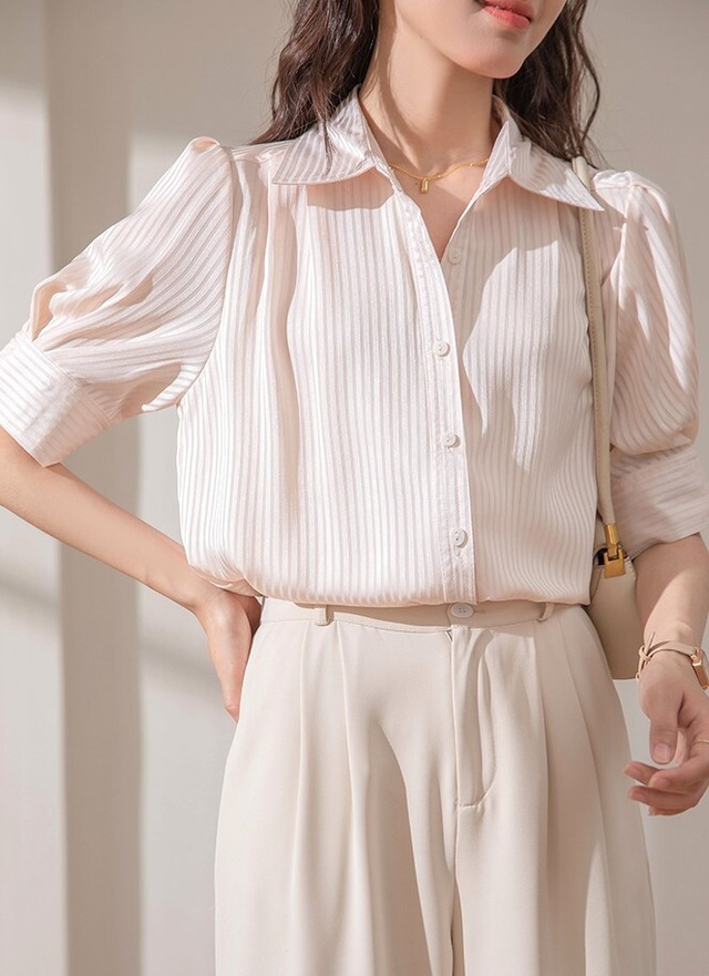 シンプルなストライプパフスリーブシャツ。スリムで細身のシルエットが女性らしい上品さをプラス。ビジネスシーンからデートや女子会まで、幅広いシーンで活躍してくれること間違いなしです。