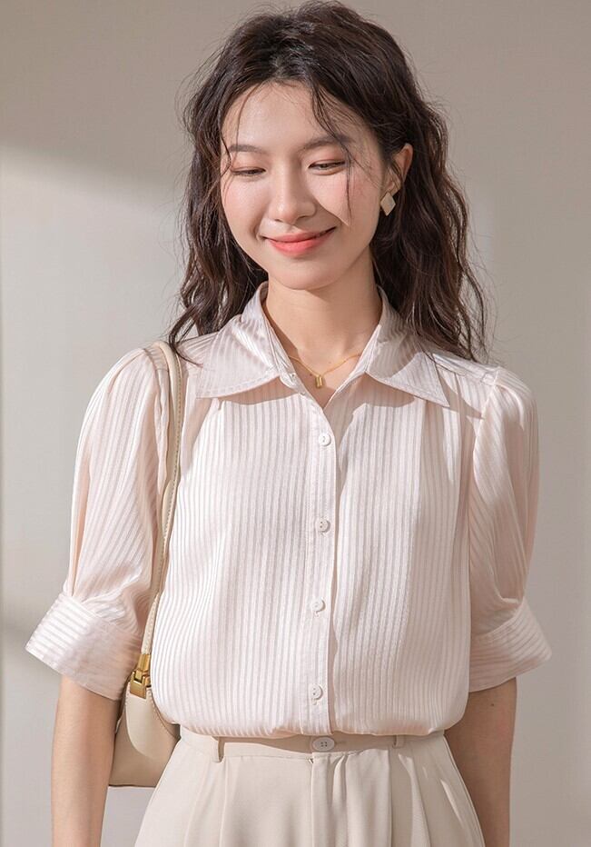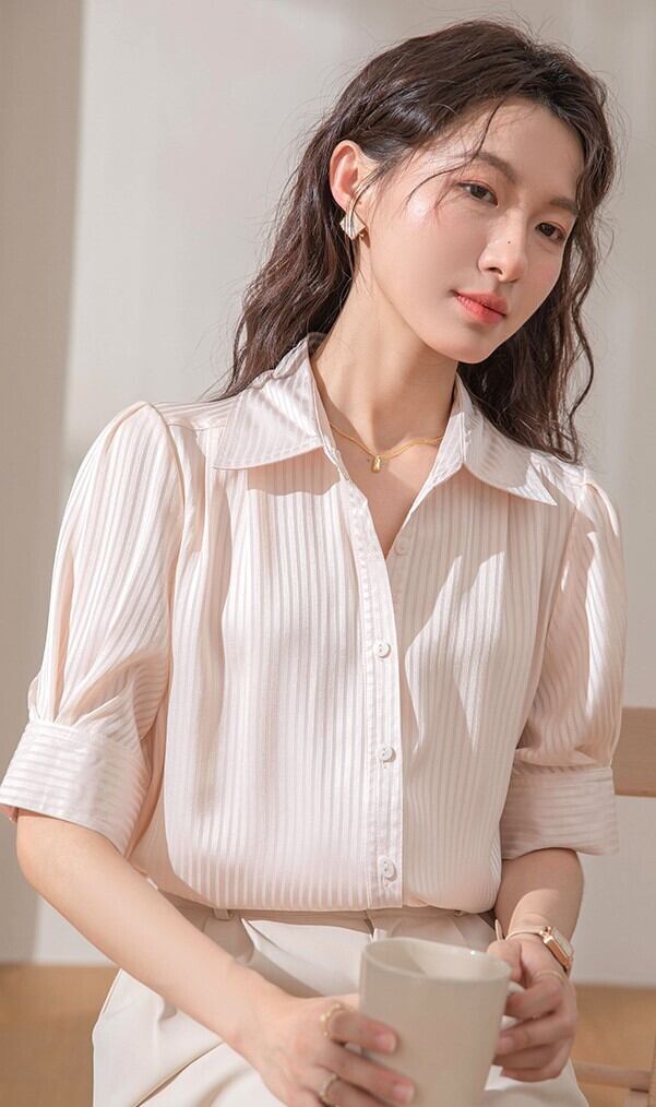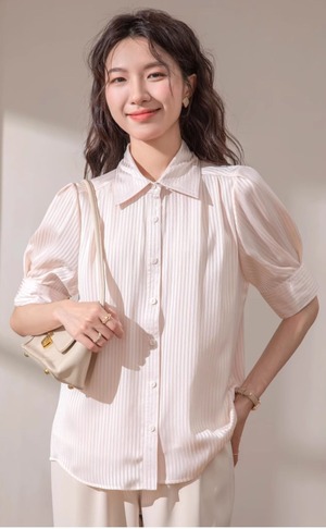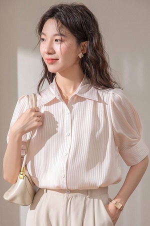 レディース トップス シャツ 半袖 パフスリーブ ポロカラー スリム 細身 ストレート かわいい 大人可愛い きれいめ シンプル カジュアル 上品 おしゃれ ガーリー ラブリー キュート ストライプ 夏 MTG ミーティング オフィス ビジネス OL 通勤 学生 デート お出かけ 女子会 ショッピング 韓国 コーデ 普段使い 着回し モテ トレンド 流行 インスタ映え S M L XL ホワイト アプリコット