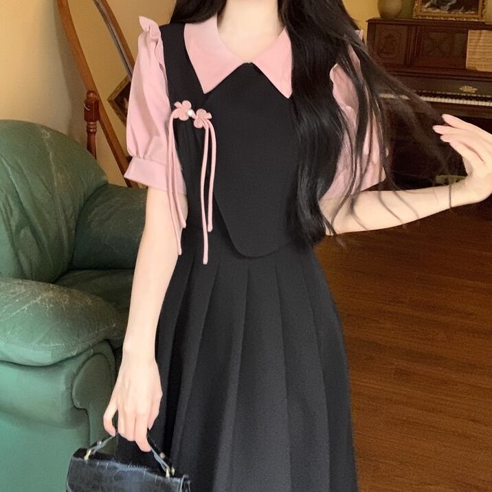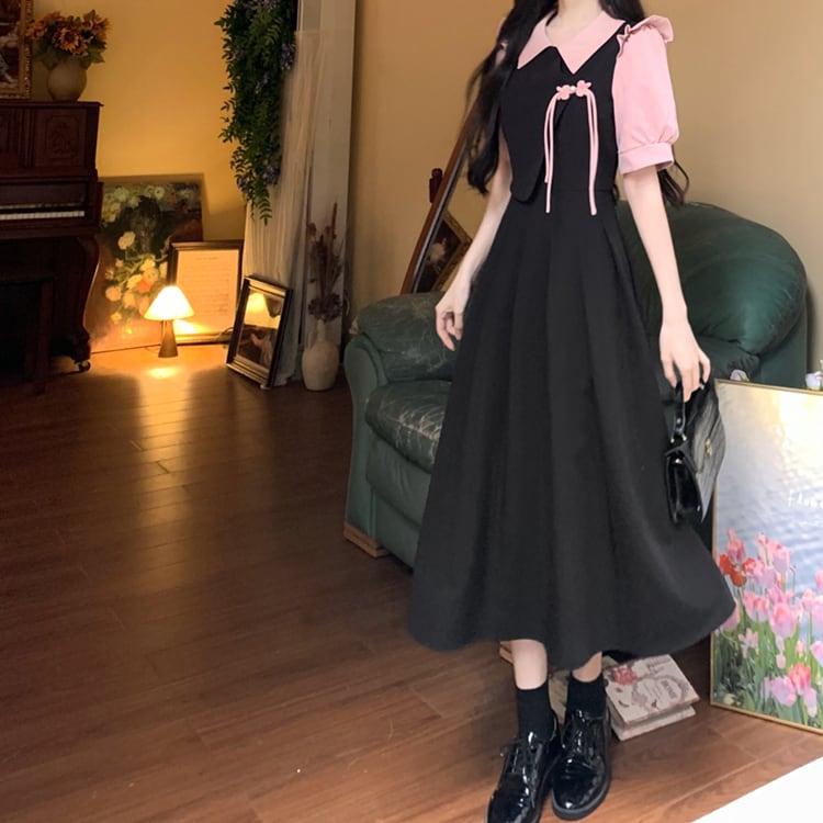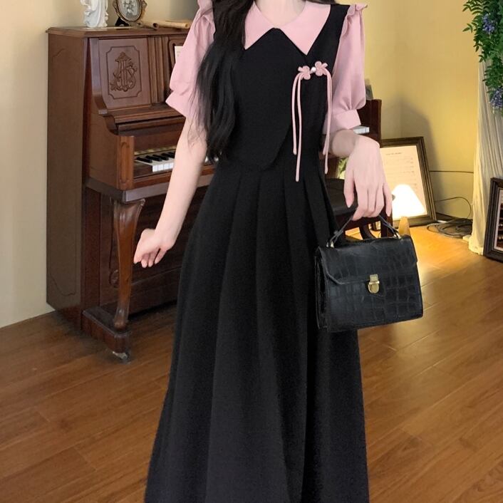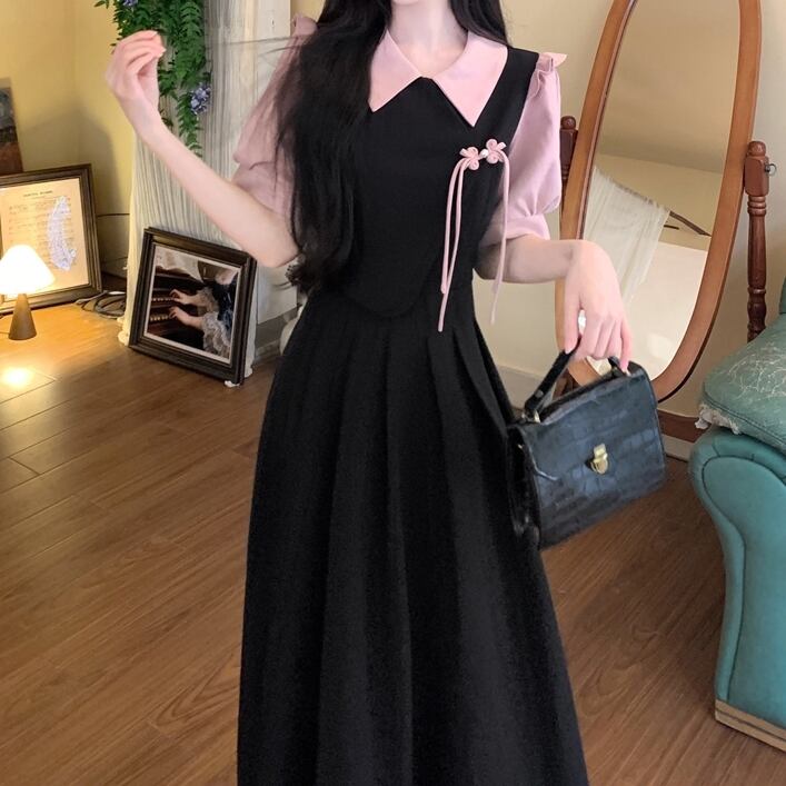 ワンピース レディース 送料無料 フレア プリーツスカート フェイクレイヤード ドッキング アジアン チャイナ服 五分袖 フリル シャツワンピ バイカラー ウエストマーク ロング丈 Aライン 襟付き 前開き ハイウエスト ウエストゴム ウエストマーク 体型カバー 脚長 細見え 華奢見え 二の腕カバー ブラック 黒色 花柄 ボタニカル柄 フラワー 抜け感 こなれ感 フェミニン 大人可愛い かわいい きれいめ 大人女子 上品 エレガント おしゃれ お洒落 春服 夏服 涼し 20代 30代 40代