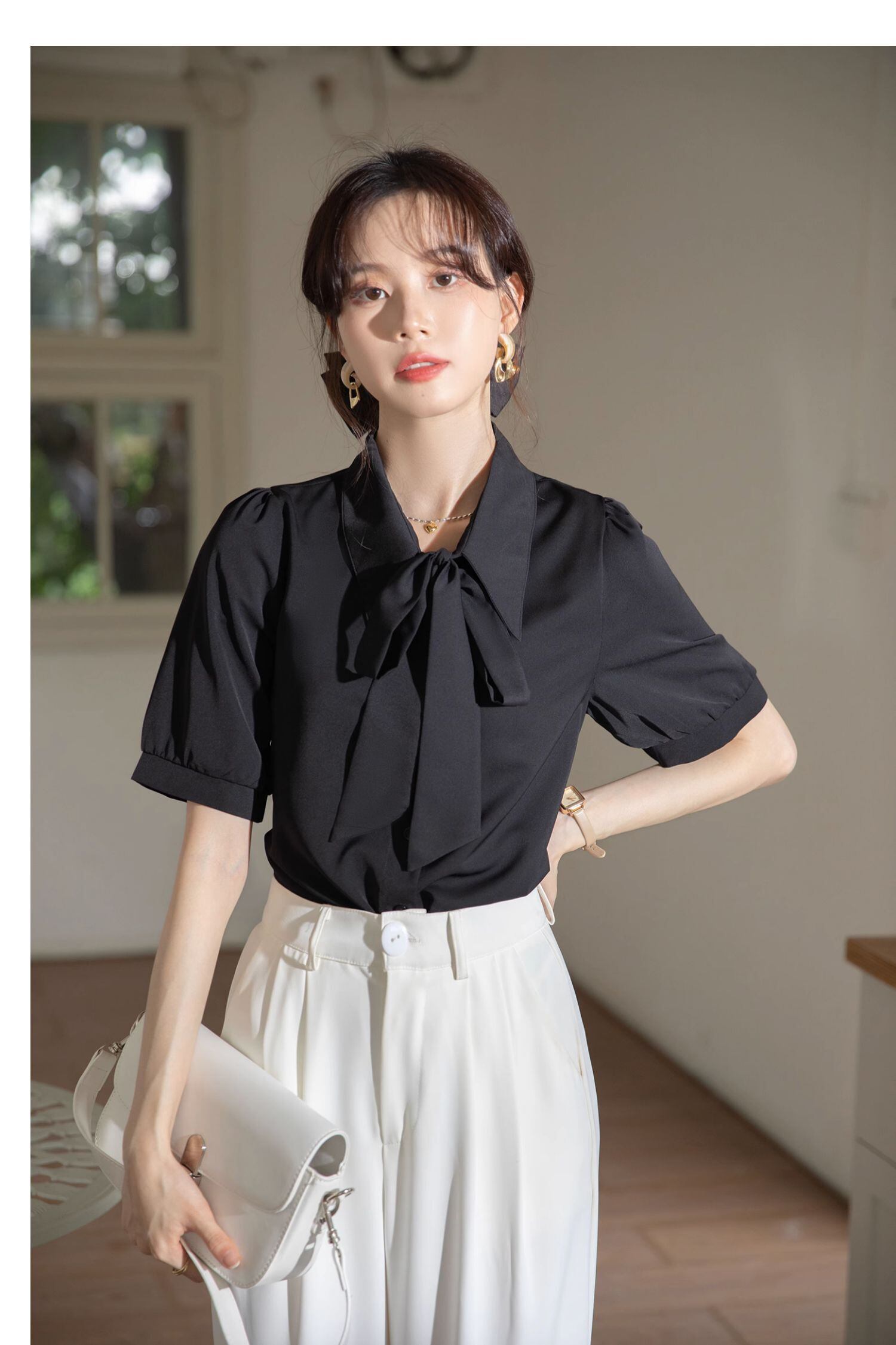 おしゃれで可愛いシルエットが魅力的なレディーストップスをお探しの方にぴったりの一枚が登場しました。袖あり半袖のパフスリーブデザインに、襟付きリボンがアクセントとなっています。前開きで着脱も簡単で、女性らしいフェミニンな印象を演出します。シンプルでありながら、エレガントで主役級の存在感を放つ一枚。オフィスやデート、お出かけなど様々なシーンで活躍すること間違いなしです。さまざまな着こなしに合わせやすく、一枚あればコーディネートの幅が広がります。大人女子にぴったりのキュートな雰囲気を演出し、周りの視線をくぎ付けにすること間違いなし!ぜひ、お手持ちのアイテムとのコーディネートもお楽しみいただければ幸いです。