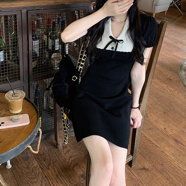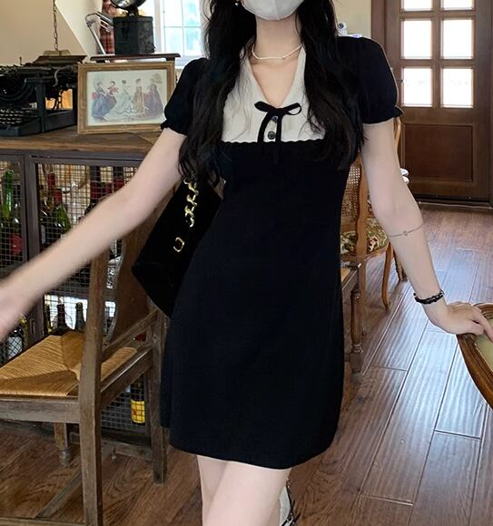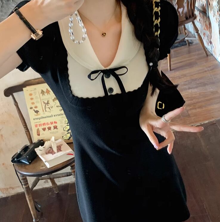 レディース ワンピース ニットワンピ ミニ 半袖 Vネック 襟付き スリム リボン かわいい 大人可愛い 上品 おしゃれ ガーリー 存在感 ラブリー キュート プリンセス ロマンティック フェミニン 無地 春 夏 秋 ロングシーズン 学生 デート お出かけ イベント 女子会 休日 ショッピング コンサート ライブ お花見 カフェ 韓国 オルチャン プレゼント 美脚 プチプラ 普段使い 着回し モテ インスタ映え XS S M L 小さいサイズ 大きいサイズ 黒 ブラック ベーシックカラー